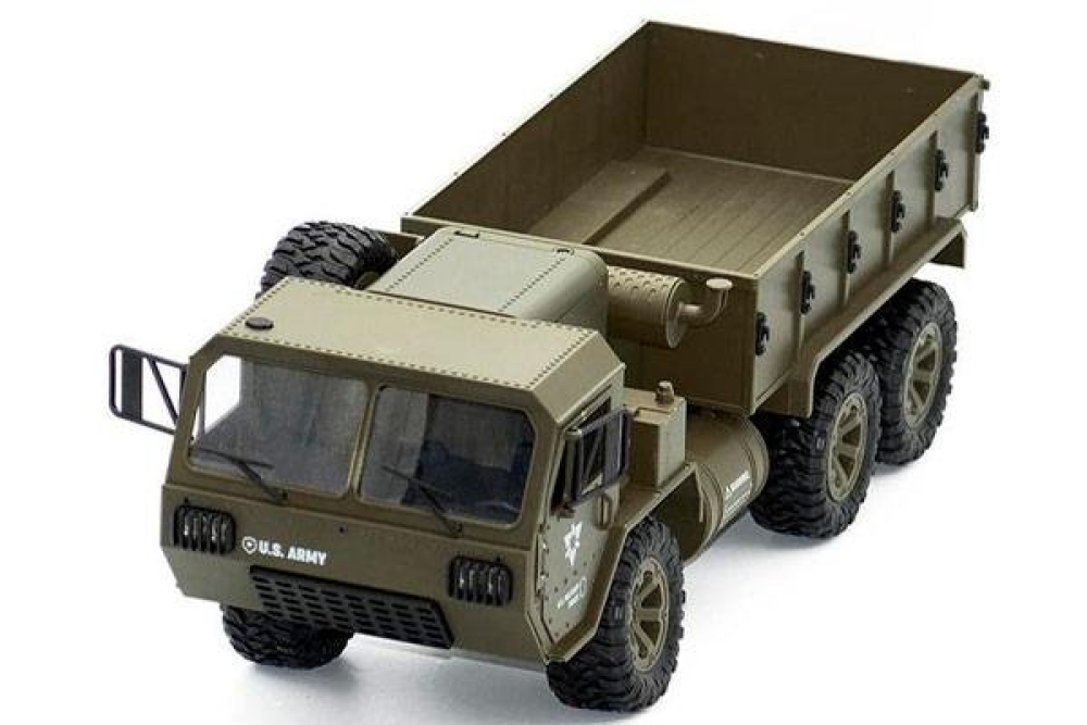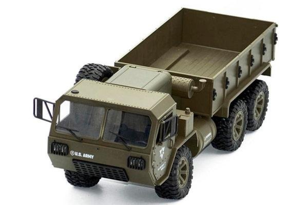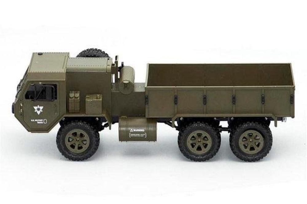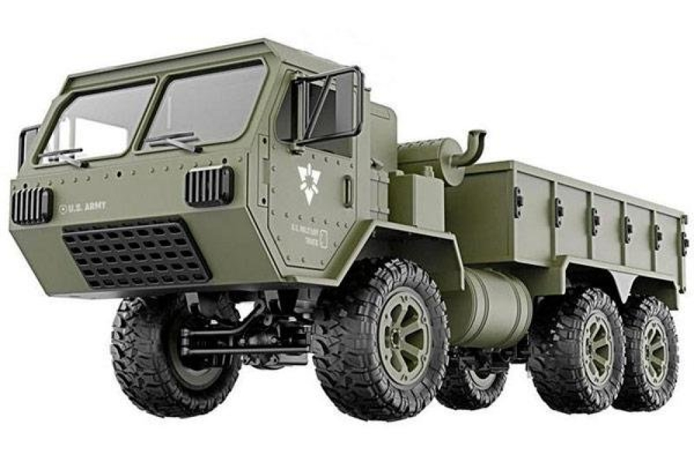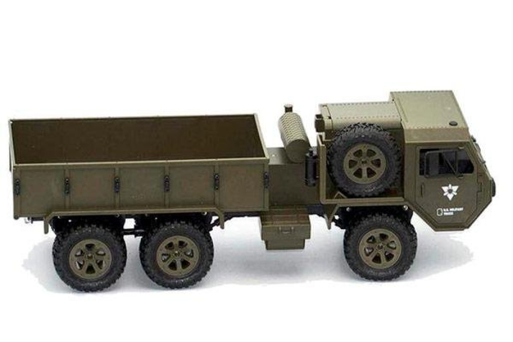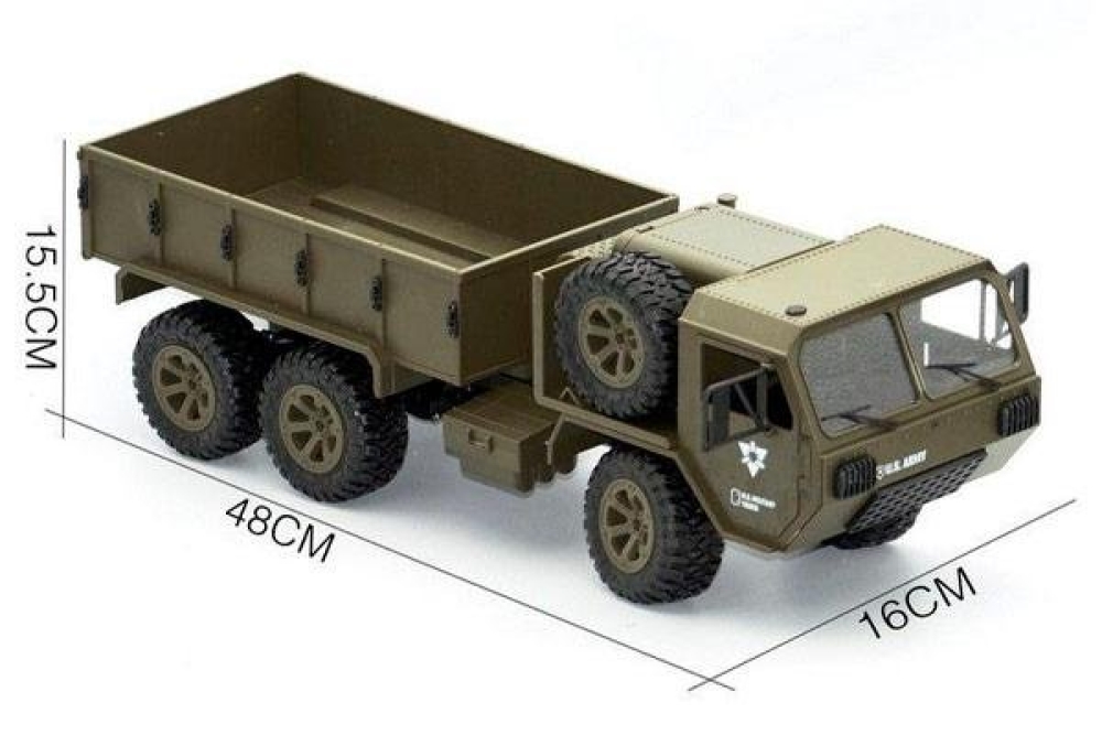 Радиоуправляемый военный грузовик Heng Long обладает полным приводом и резиновыми колёсами с глубоким протектором. Он полностью повторяет оригинальной американский грузовик. Имеет открывающиеся двери кабины. Полный привод работает по формуле 6WD, дальность действия более 50 метров 2.4Ghz, а время работы больше 25 минут. Дополнительно установлены светодиодные фары, которые позволят кататься в тёмное время суток, освещая путь. Коллекторный двигатель способен разогнать автомобиль до 15 км/ч , а 4 канала управления позволяют ездить и поворачивать во всех направлениях, высокий клиренс делает эту машинку на пульте управления способной преодолевать небольшие водоемы и достаточно суровое бездорожье. Масштаб автомобиля 1:16, при длине 48 см. Заглянув под автомобиль вы увидите рессорную подвеску и движущиеся приводные валы с дифференциалами, в общем все как в настоящем грузовике.