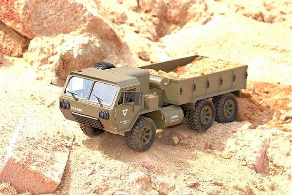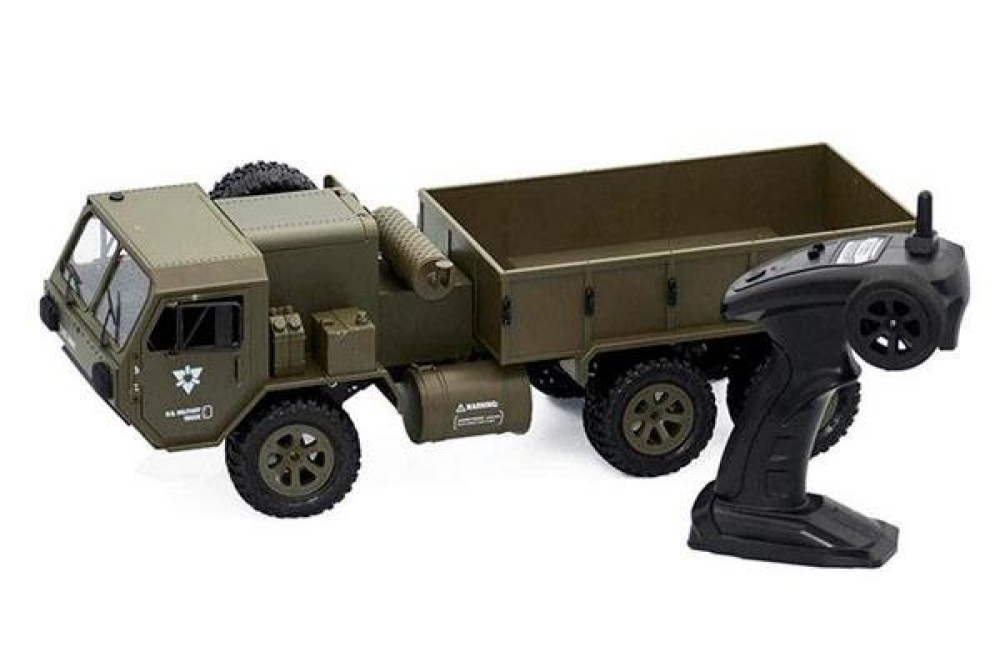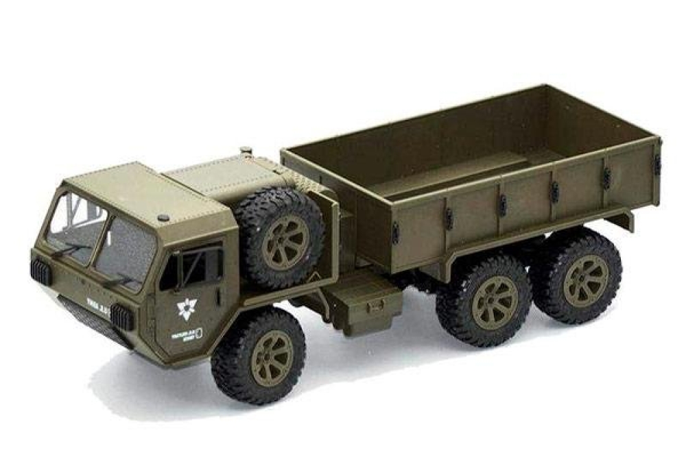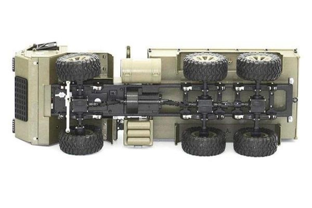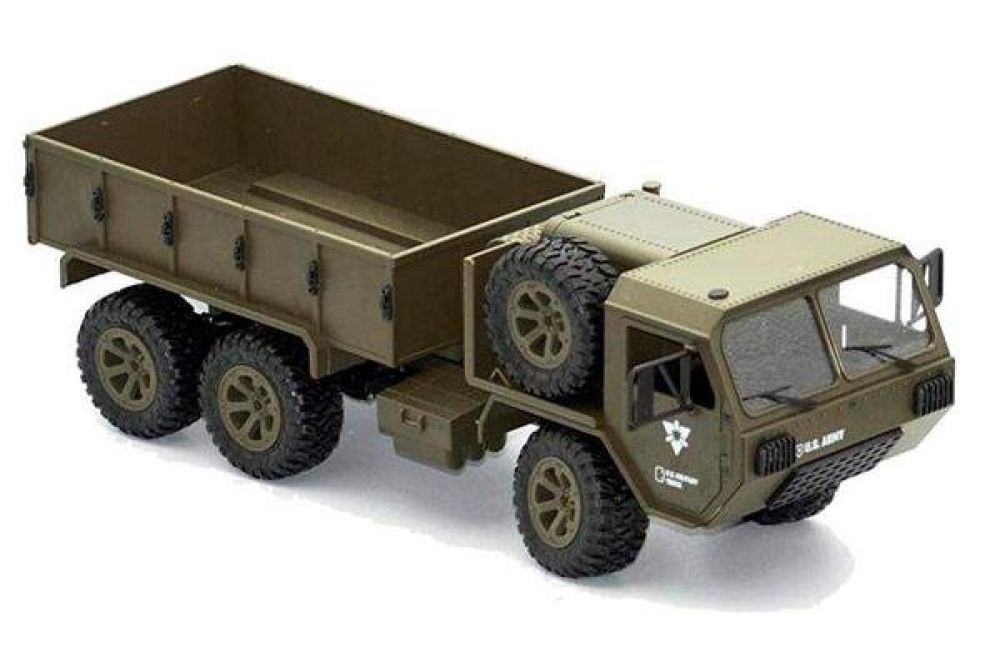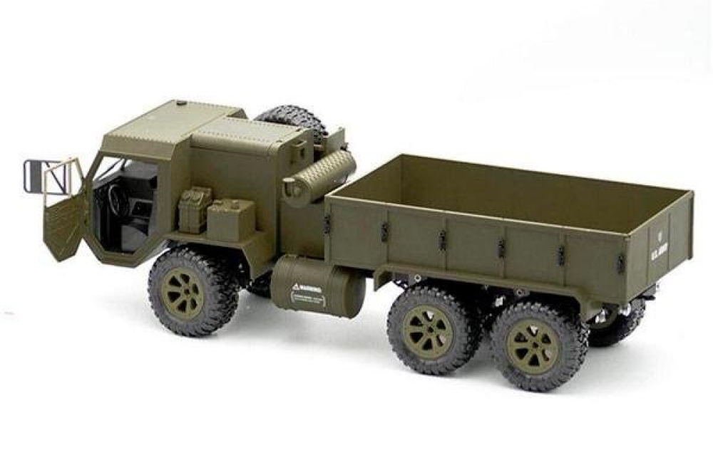 Радиоуправляемый военный грузовик Heng Long обладает полным приводом и резиновыми колёсами с глубоким протектором. Он полностью повторяет оригинальной американский грузовик. Имеет открывающиеся двери кабины. Полный привод работает по формуле 6WD, дальность действия более 50 метров 2.4Ghz, а время работы больше 25 минут. Дополнительно установлены светодиодные фары, которые позволят кататься в тёмное время суток, освещая путь. Коллекторный двигатель способен разогнать автомобиль до 15 км/ч , а 4 канала управления позволяют ездить и поворачивать во всех направлениях, высокий клиренс делает эту машинку на пульте управления способной преодолевать небольшие водоемы и достаточно суровое бездорожье. Масштаб автомобиля 1:16, при длине 48 см. Заглянув под автомобиль вы увидите рессорную подвеску и движущиеся приводные валы с дифференциалами, в общем все как в настоящем грузовике.