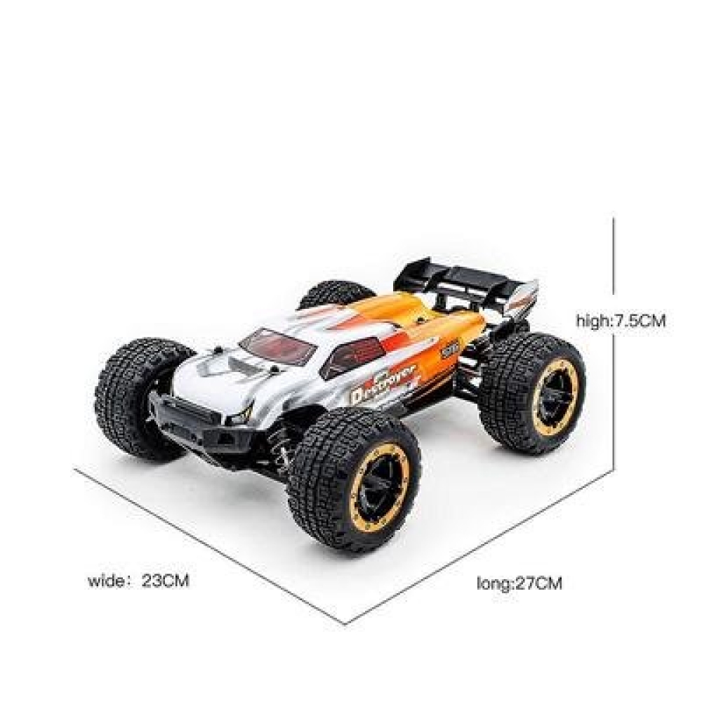 Тяги руля регулируются, есть опции заднего хода и тормоза. Модель легка в управлении, пульт ДУ - куркового типа, помехозащищенный. Машинка поставляется уже готовой к заездам - Вам остается только поставить аккумулятор.