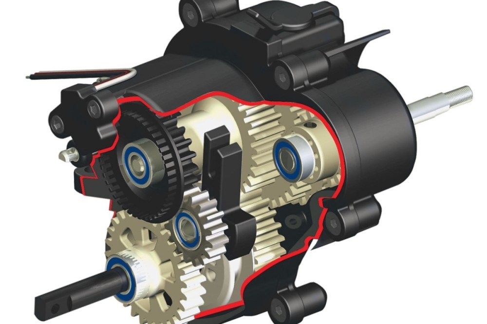 Двухступенчатая автоматическая коробка перемены передач обеспечивает быстрый разгон и высокую максимальную скорость. Имеет задний ход. За работой трансмиссии следит электронный контроллер Opti Drive, он не даст вам включить заднюю передачу на ходу во избежание поломки КПП. Момент переключения с 1й на 2ю передачу можно настраивать в соответствии с Вашими пожеланиями. Все валы КПП оснащены шариковыми подшипниками. Модель имеет постоянный полный привод с распределением момента 50/50 между осями.