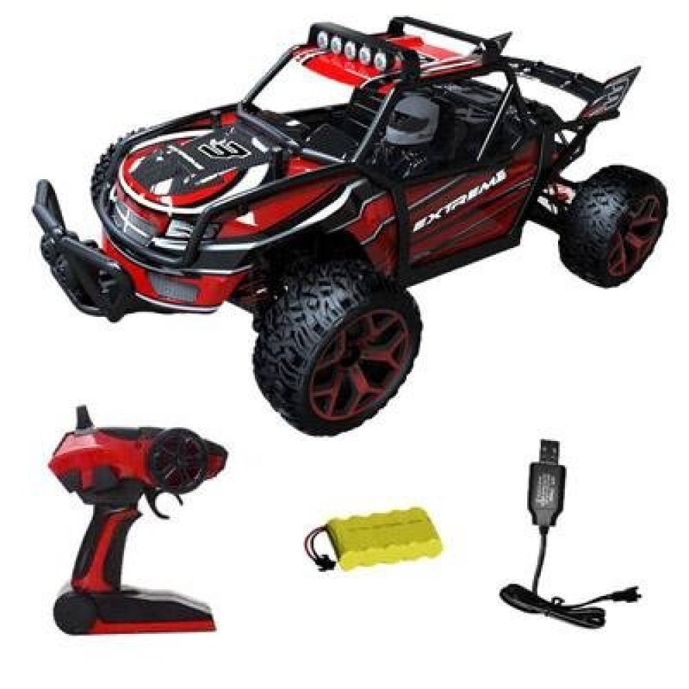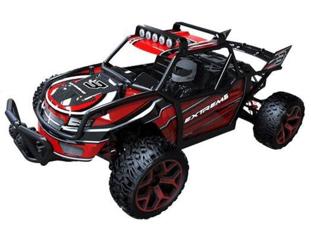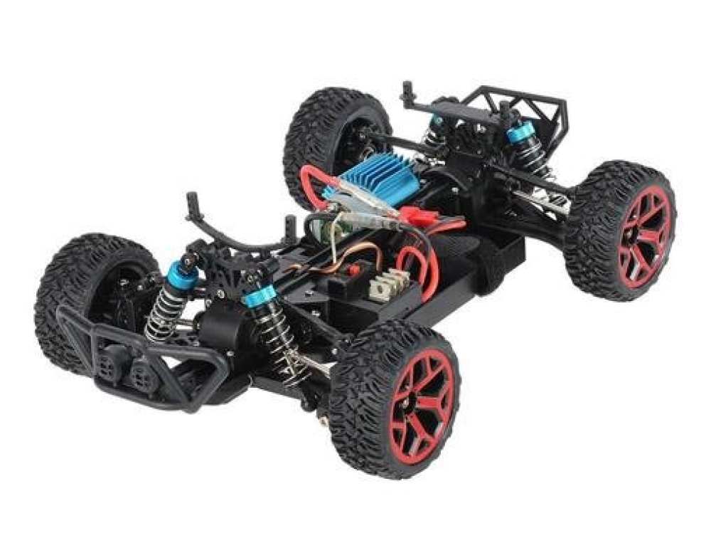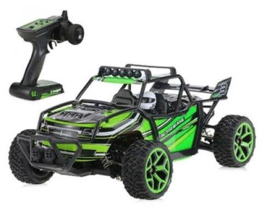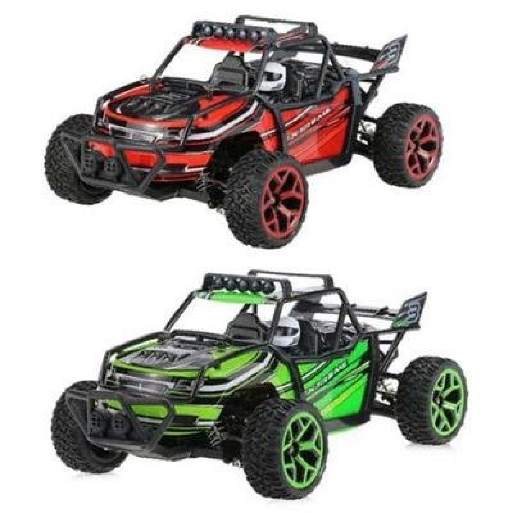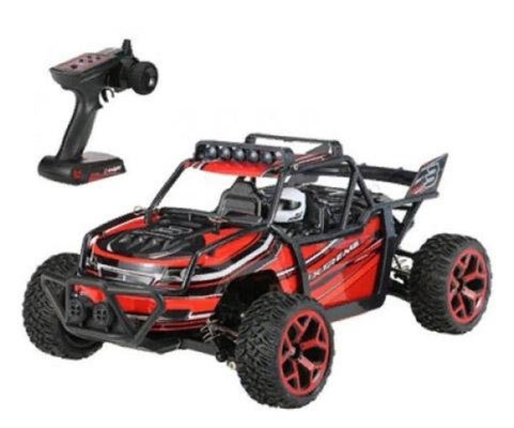 Небольшой полноценный багги для скоростных заездов по дому или сухим уличным поверхностям. Несмотря на низкую цену имеет почти все то же самое что и у более дорогих моделей - коллекторный мотор с радиатором охлаждения, регулятор оборотов и серво, подвеску с амортизаторами и металлическими приводами колес. Кузов выполнен в классическом дизайне с дополнительной трубчатой рамой, которая защищает водителя при опрокидывании на высокой скорости. В кабине вы обнаружите пилота-водителя в спортивном шлеме.