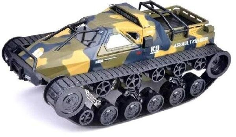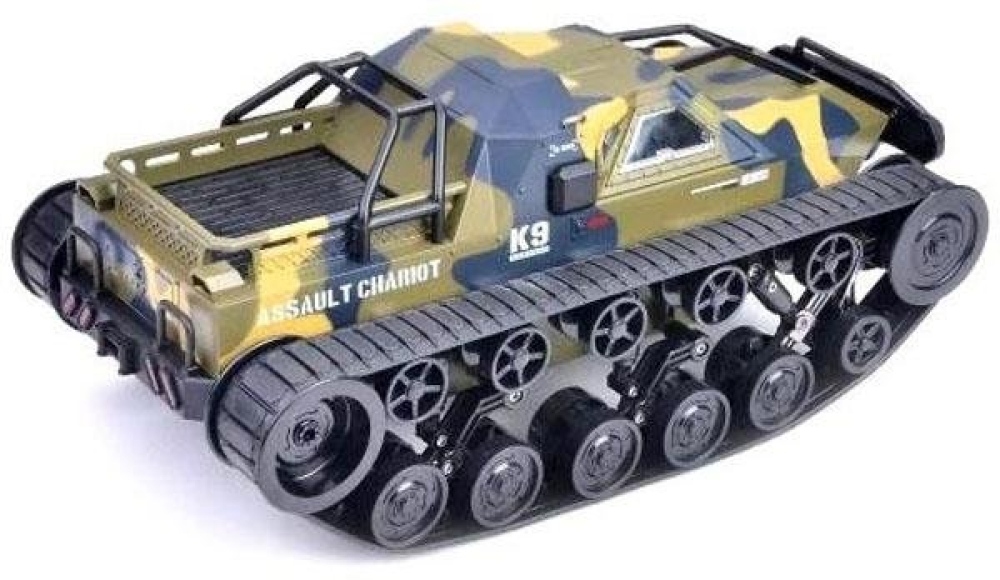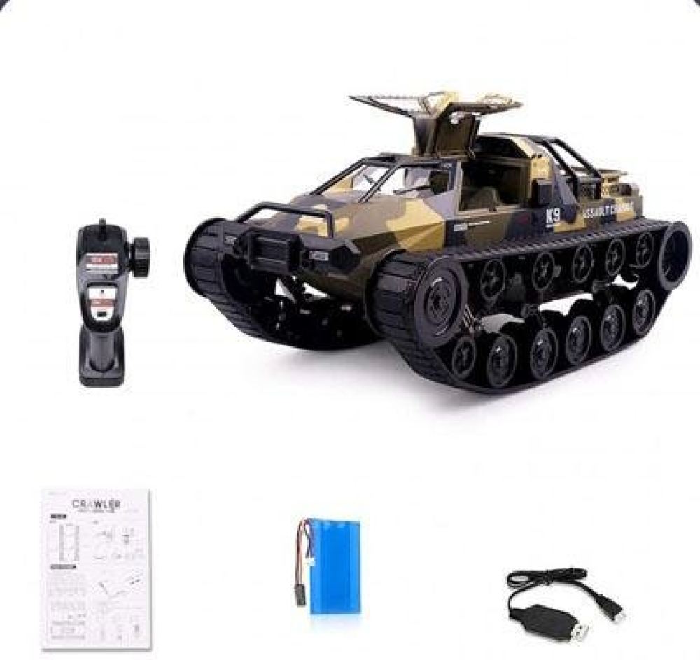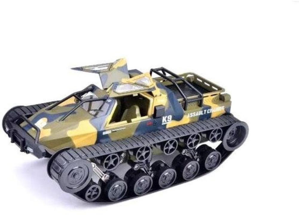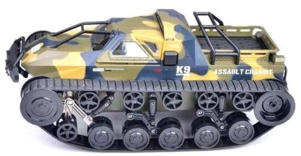 Этот гусеничный вездеход амфибия способен преодолевать пересечённую местность там, где не проедет не один полноприводный автомобиль. Оснащен амортизаторами и поэтому вездеход плавно преодолевает любого рода насыпи из камней, палок и так далее. Оснащен усиленной рамой, что придает прочности всей конструкции, кабина выполнена в очень высокой детализации, вы можете открыть двери и заглянуть в кабину. Несмотря на то что данная машинка игрушка является практически танком, она имеет достаточно высокую скорость и разгоняется до 12 км/ч. На вездеход установлен емкий аккумулятор на 1200 mah, а время игры составят более 20 минут. Пульт управления 2.4 ГГц имеет дальность управления машины до 100 м. В зависимости от типа дорожной поверхности Вы можете регулировать натяжение гусениц для большей проходимости, максимальный угол подъема составляет 30 градусов.