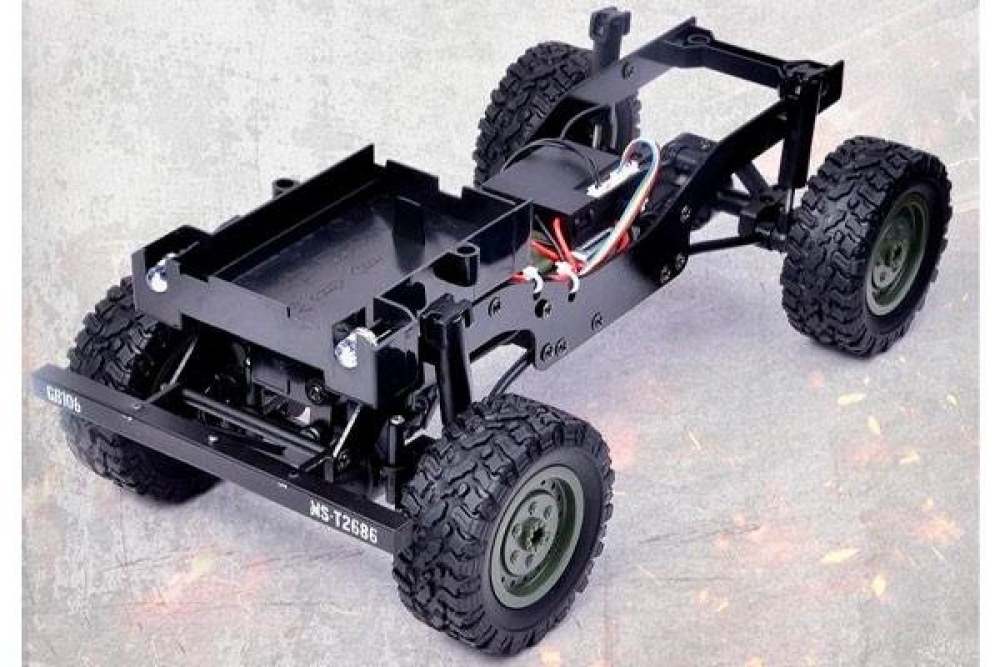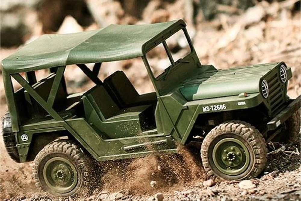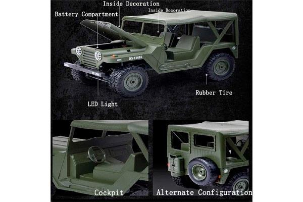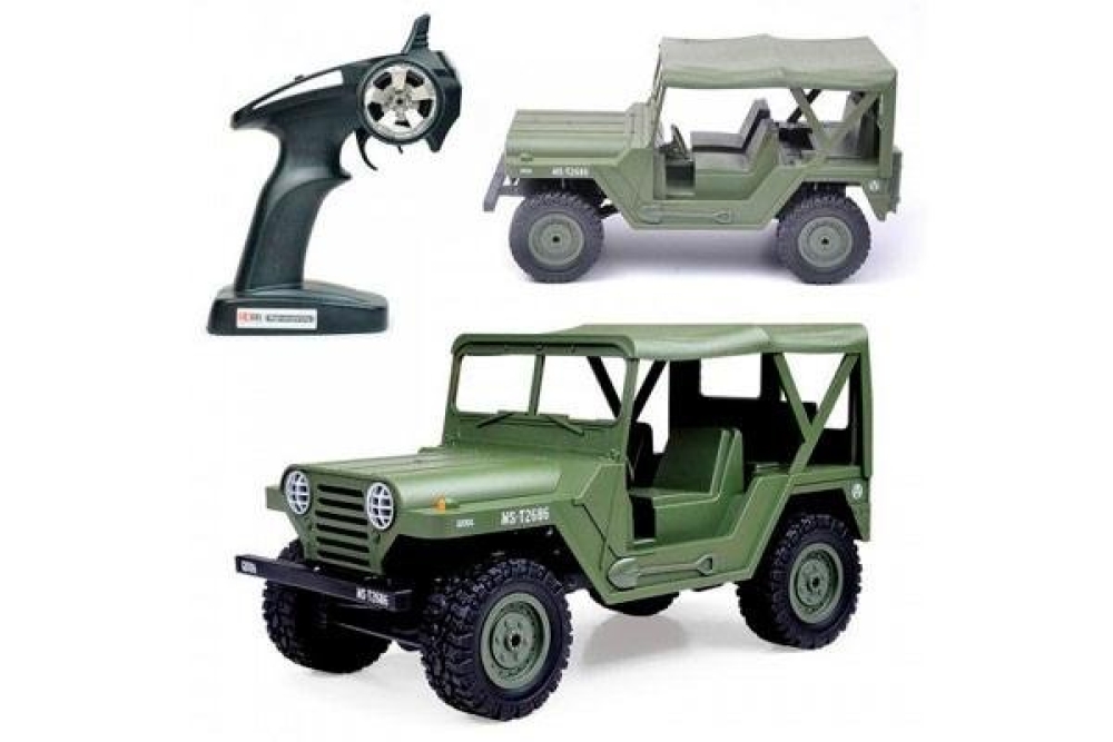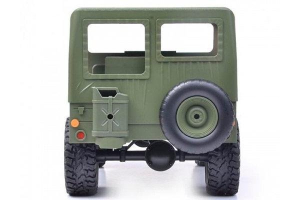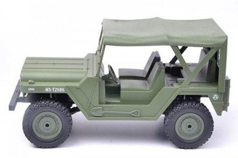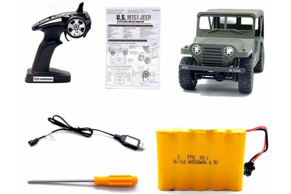 Данная радиоуправляемая машинка M151 MUTT (military utility tactical truck) является точной копией армейского джипа который выпускался с 1959 по 1982 год и широко использовался во время войны во Вьетнаме. Он обладает высочайшей детализацией как кузова, так и салона, а на корпусе вы можете увидеть такие элементы как дополнительные канистры с топливом, запасное колесо, топор и лопата. Автомобиль имеет полный привод и подвеску с амортизаторами. Модель оснащена светодиодными фарами, что поможет кататься в тёмное время суток. Полный привод работает по формуле 4wd. Модель оснащается пропорциональным сервоприводом рулевого управления. Пульт управления имеет частоту 2.4 ГГц и позволяет управлять машинкой на расстоянии до 100 м. Аккумуляторная батарея емкостью 500 mah позволит кататься до 20 минут, а максимальная скорость у внедорожника 15 км/ч . Модель имеет масштаб 1:14 и составляет более 30 см в длину, а дородный просвет 3.5 см. У машинки открывается капот, куда помещается аккумулятор. Вес автомобиля составляет 747 г.