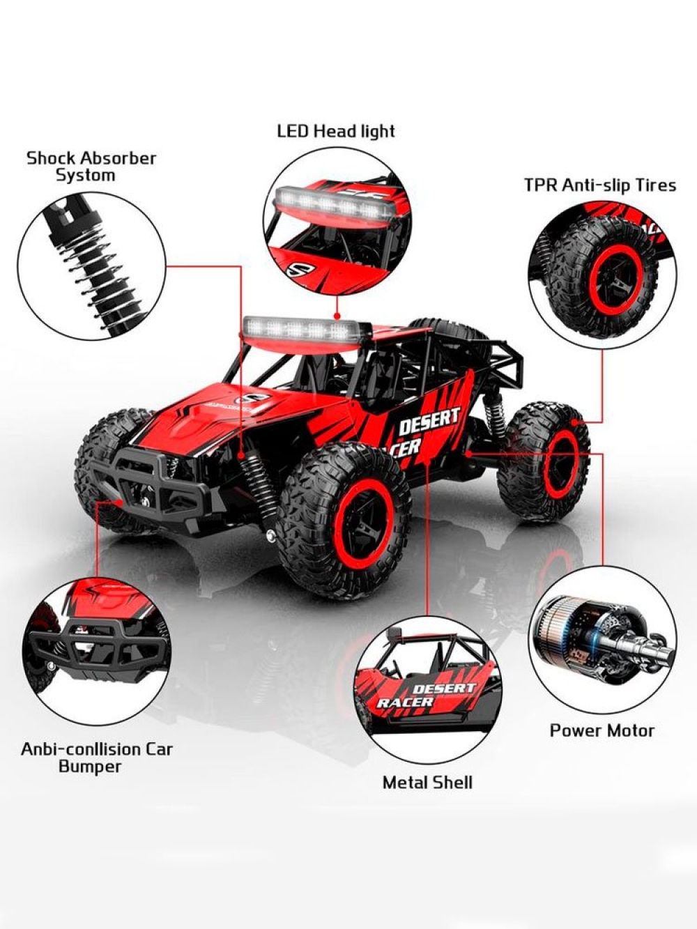Прочные резиновые внедорожные шины с надежным сцеплением с дорогой помогают Desert King двигаться на высокой скорости, не переворачиваясь. Модель оснащена независимой амортизирующей конструкцией подвески каждого колеса.