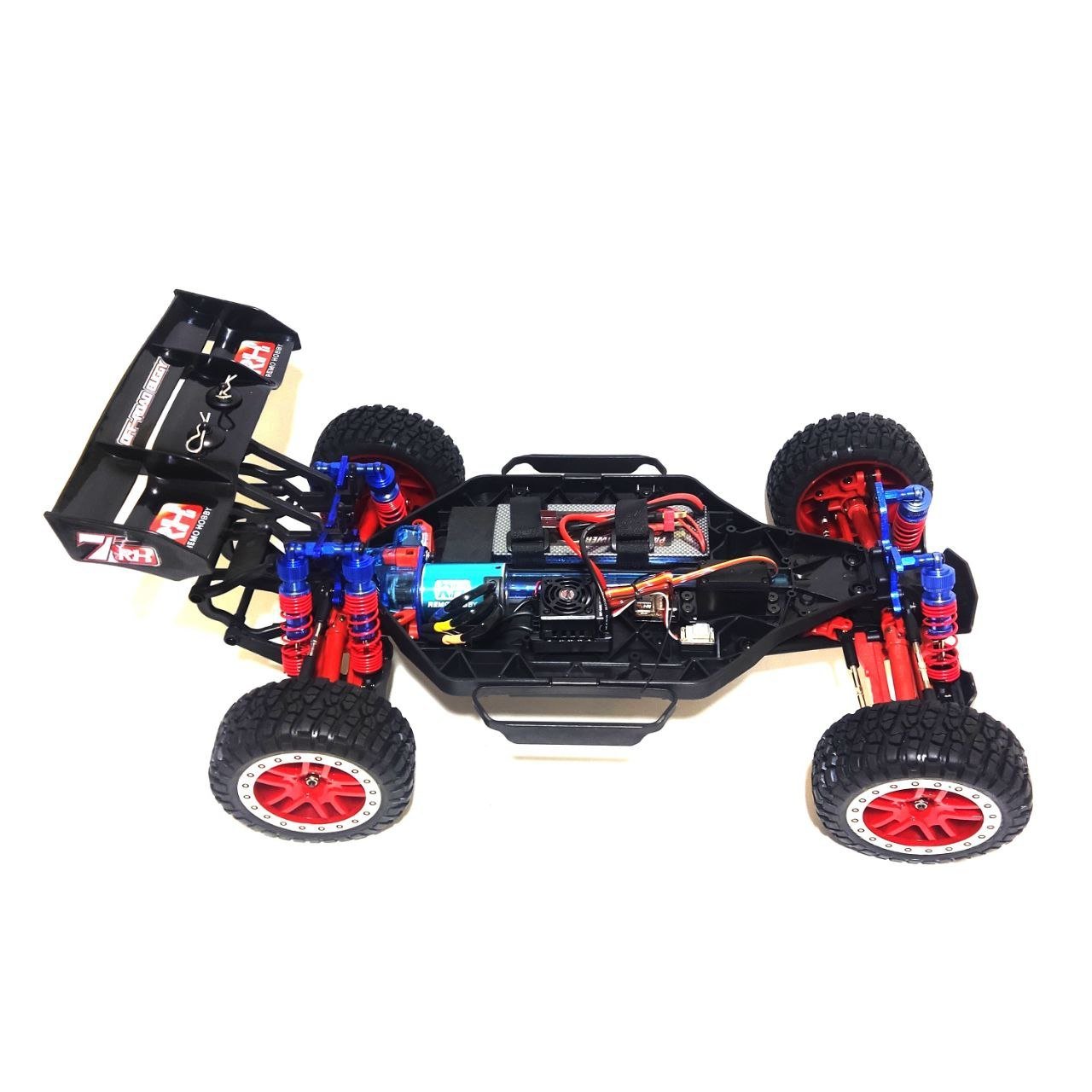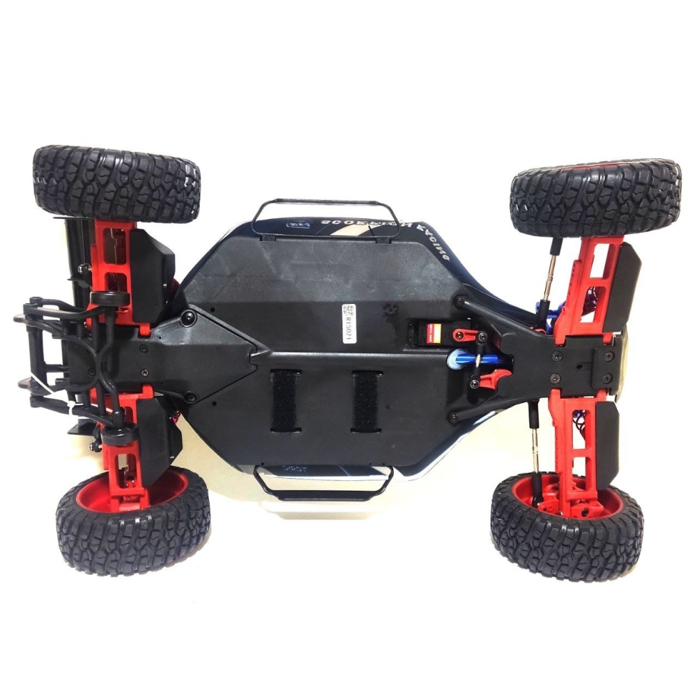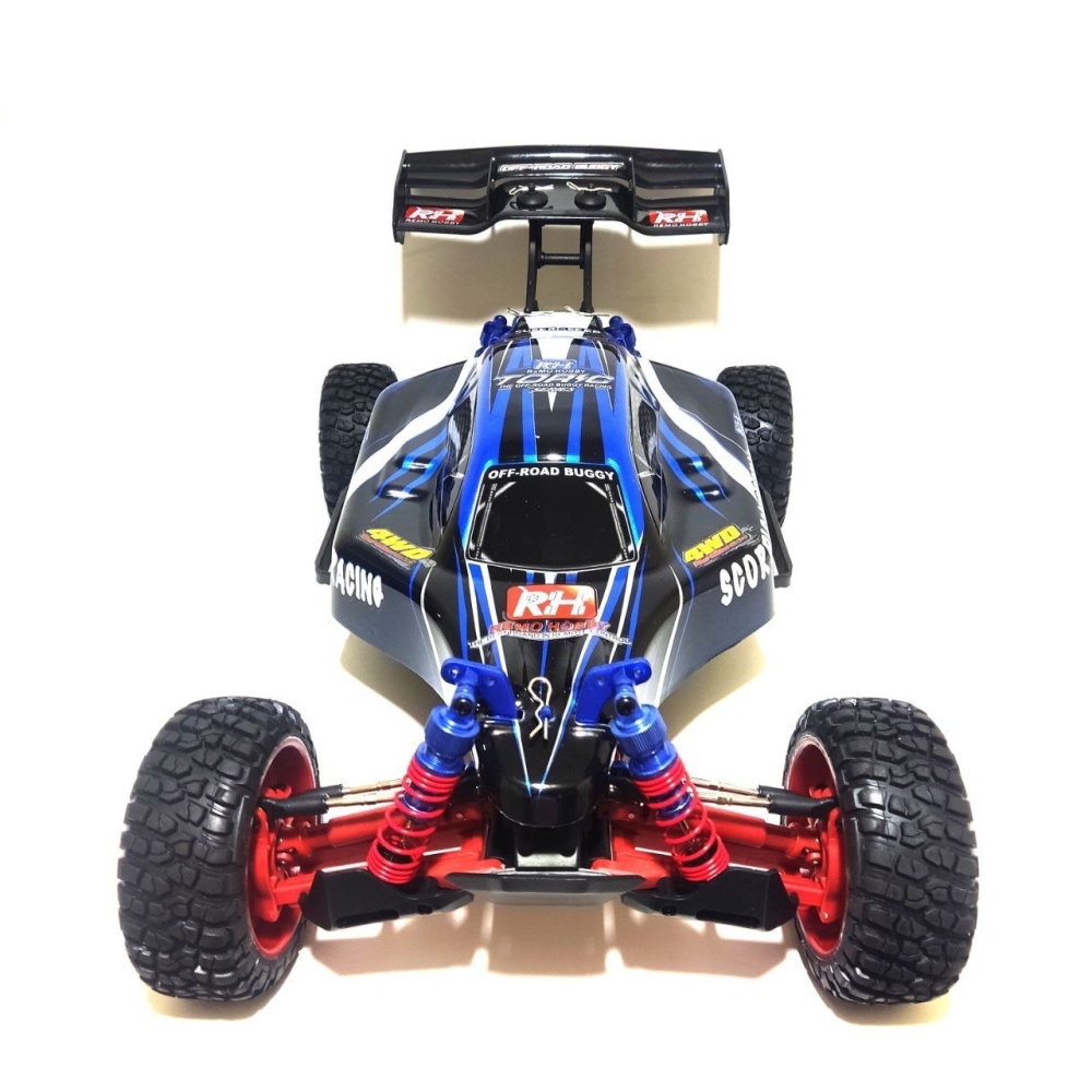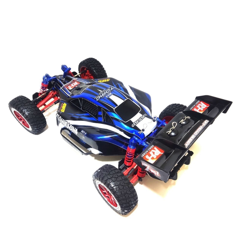 Багги на пульте управления большого размера порадует вас своей высокой скоростью и проходимостью. Универсальное шасси выполнено из качественных материалов, и хорошо сбалансировано. Имеет металлический кардан и шестерни трансмиссии. Подвеска многорычажная и независимая, задняя колея имеет двойные амортизаторы. Все рычаги и приводы колес выполнены из усиленного нейлонового пластика. Передние рычаги дополнительно оснащены защитными пластинами, которые дополнительно оберегают подвеску при сильных ударах. Передние колеса можно настраивать (развал-схождение). Также шасси имеет боковые амортизаторы, поэтому машинку можно пустить в занос, не боясь поломки при боковом ударе.