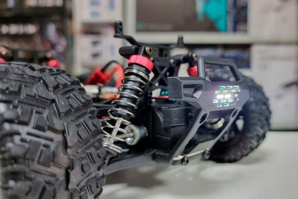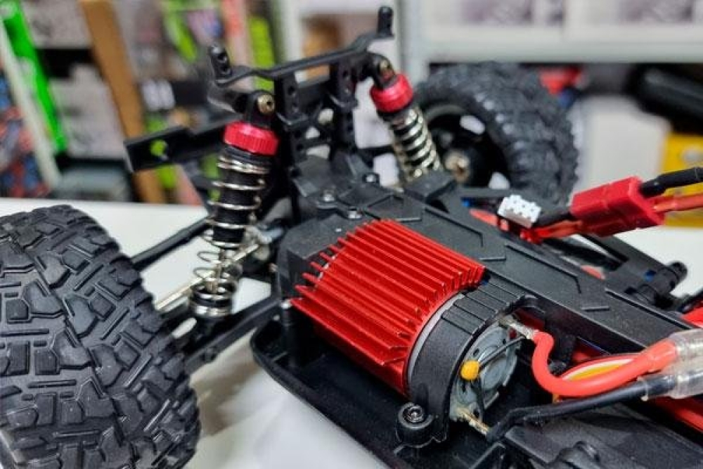 Электроника: влагозащищенный регулятор оборотов управляет сервомашинкой и электромотором. Коллекторный мотор развивает скорость до 40-50 км/ч. Полностью пропорциональное управление серво и подачей газа.