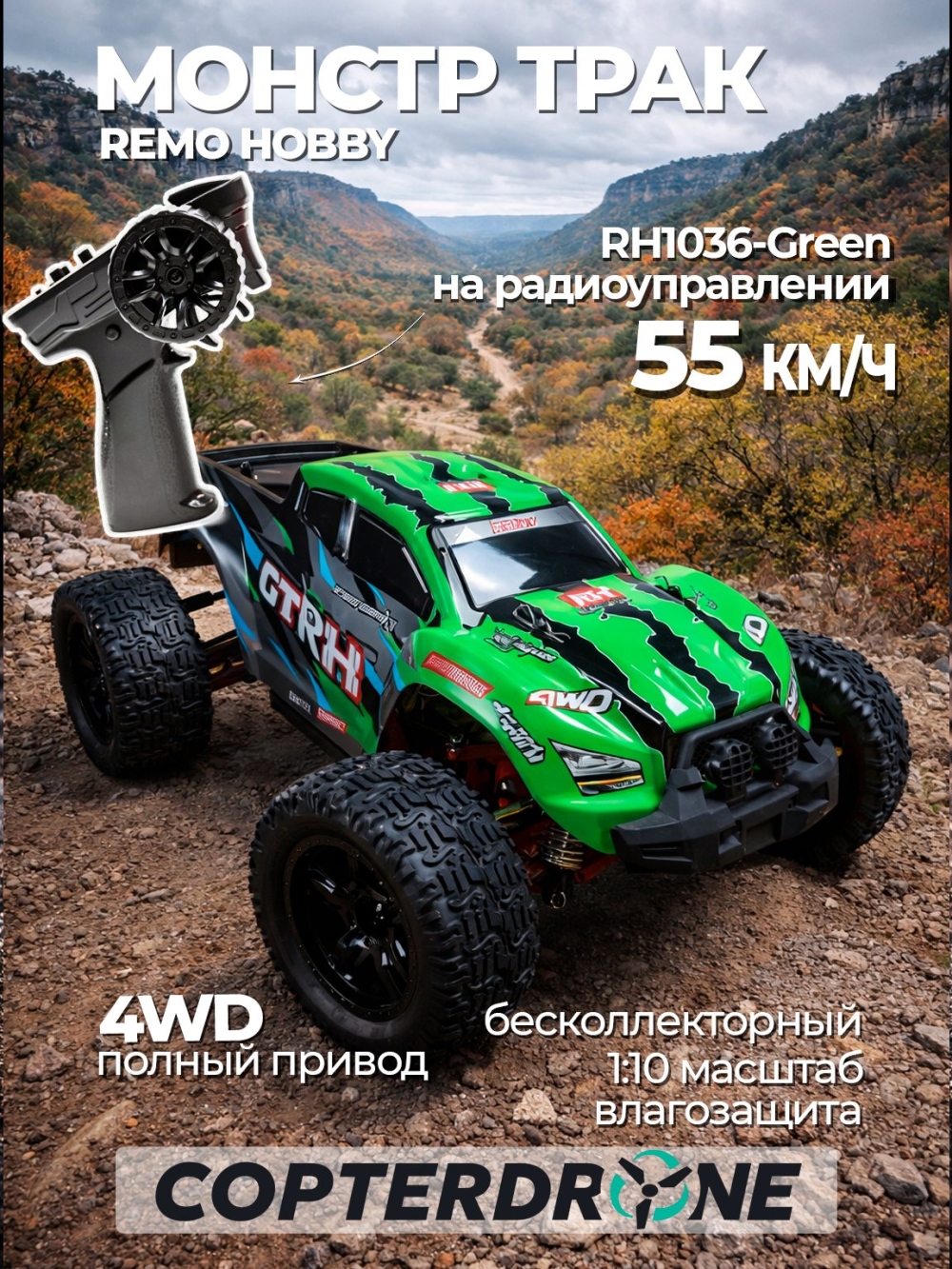 Радиоуправляемая машина монстр Remo Hobby SCALE 4WD OFF-ROAD 1:10 Brushless RTR 2.4G RH1036-GREEN