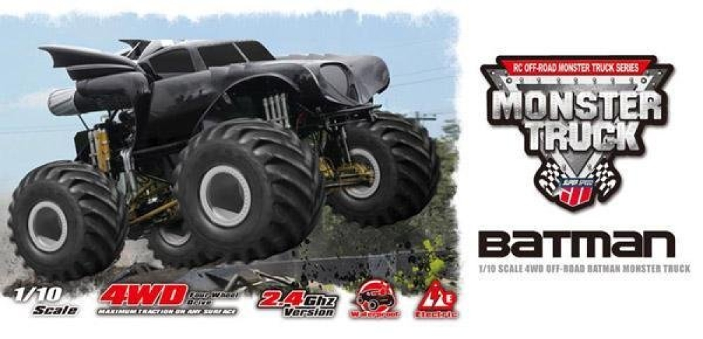 Монстр трак выполненный в формате знаменитого бэтмобиля. Оснащен большими колесами и предназначен для полного бездорожья. Отличается высокой проходимостью, благодаря 4x4 приводу. Имеет двойные амортизаторы и металлические рычаги подвески. Трансмиссия также имеет металлические детали, а колеса приводят в движение система карданных приводов. Шестерни дифференциалов также выполнены из металла, что существенно увеличивает срок службы машинки.