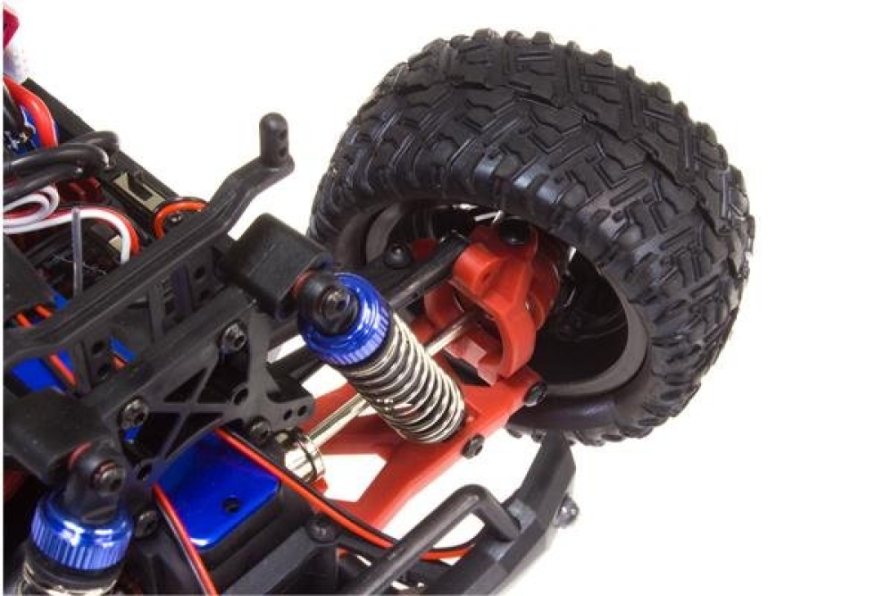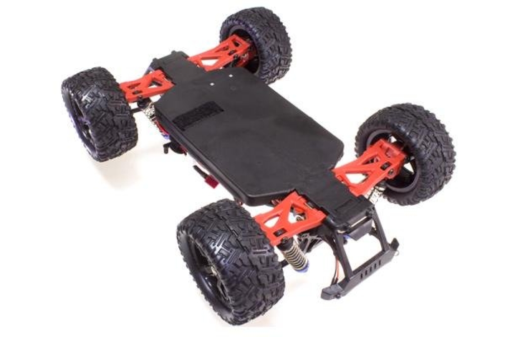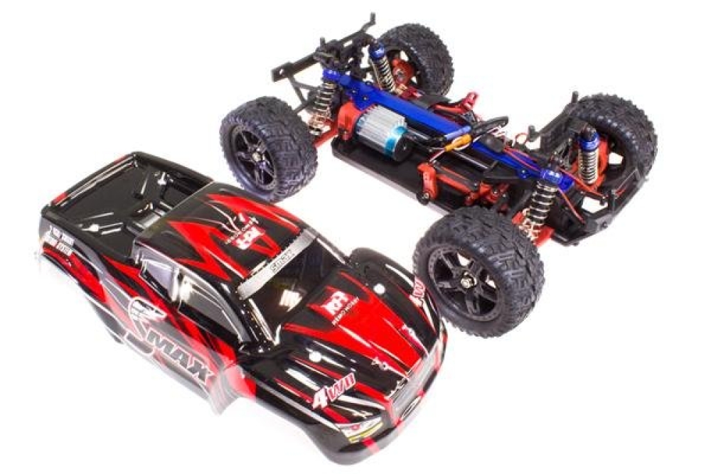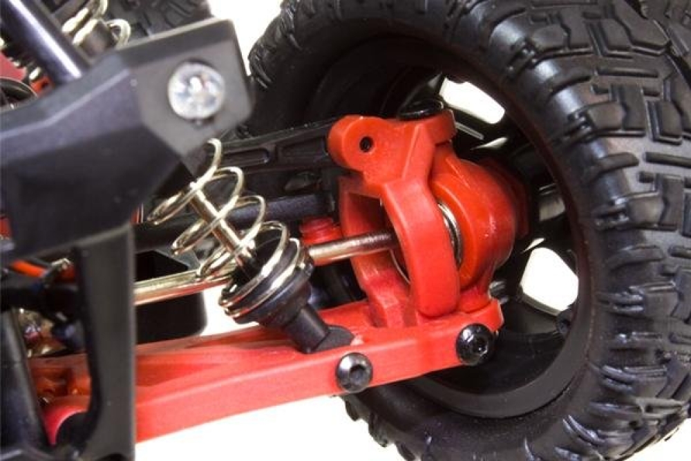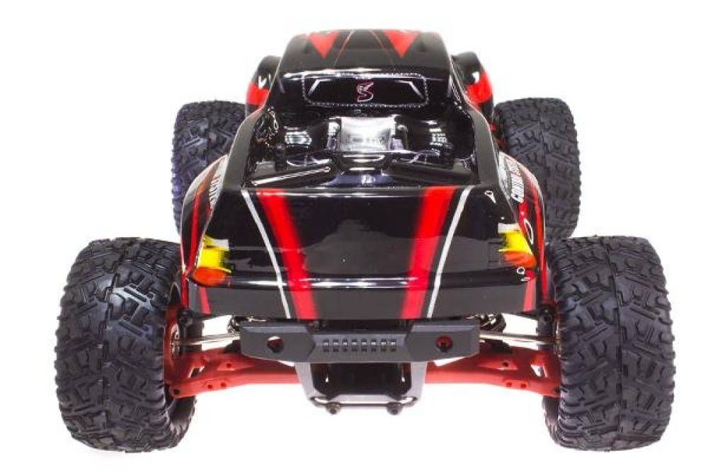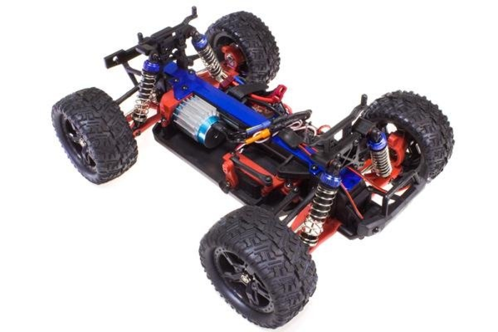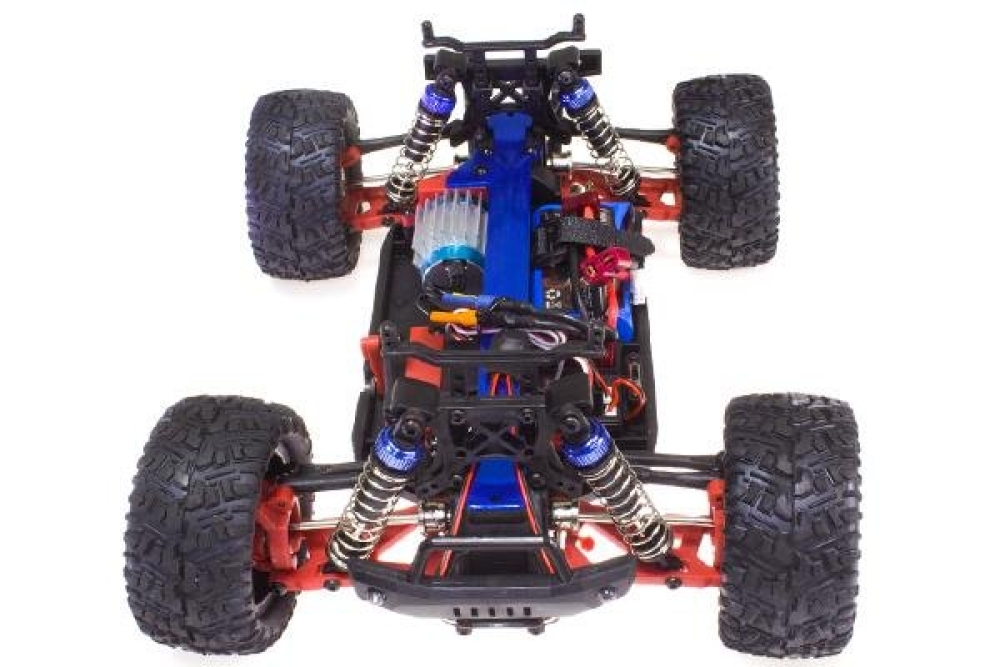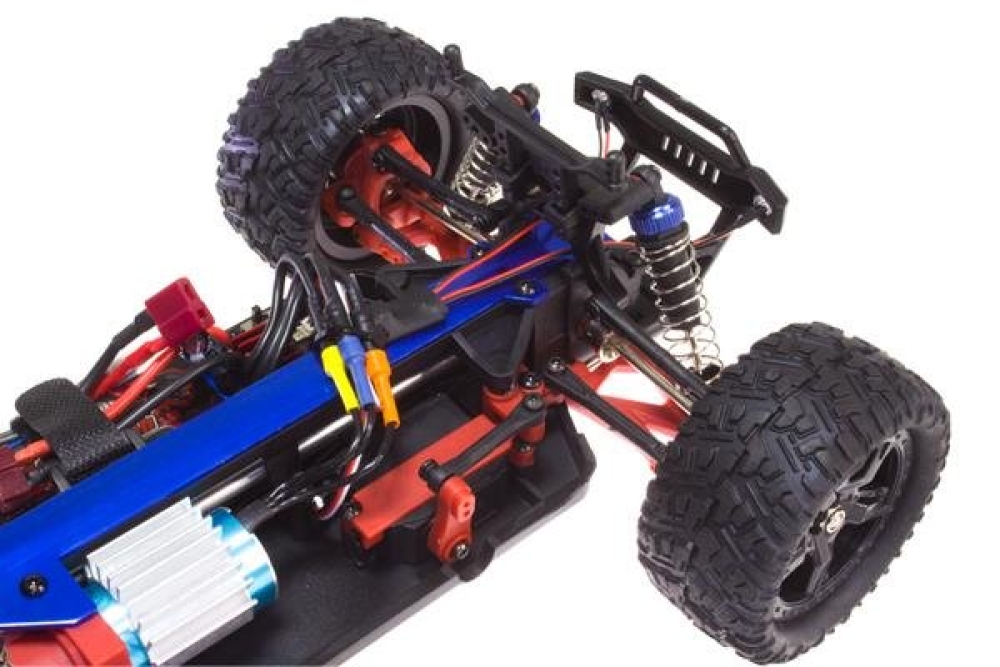 Remo Hobby Brushless Edition красного цвета с тюнингованными элементами позволит вам держать курок газа на максимуме. В данной машинке все выполнено в необходимом балансе: бесколлекторный мощнейший двигатель не просто даёт огромную тягу, но еще и невероятно долговечен (в отличие от коллекторных моторов), а чтобы эту мощь выдерживать рама и подвеска усилена специальными деталями. Например все нижние рычаги по кругу выполнены из усиленного АБС пластика, также как и кулаки. Серво тут тоже стоит усиленная, как и защитный корпус мотора. Приводы колес тут вообще установлены металлические, чтобы справляться с крутящим моментом. Шасси осталась прежней, но теперь сверху прочность ей придает мощная стальная пластина, проходящая вдоль всей рамы. Скорость автомобиля составляет 50 км/ч, а время езды до 25-30 минут при дальности действия в 150 метров. Аккумулятор стал на 200 mah более емким и теперь 1500 mah Li ion батарея идет в базовой комплектации. Полная влагозащита электроники позволяет гонять по лужам при полном погружении в воду. Не стоит использовать машинку в соленой воде. После воды требуется полностью просушить модель. Комплект готов к эксплуатации, дополнительно требуется только 4 батарейки АА в пульт управления.