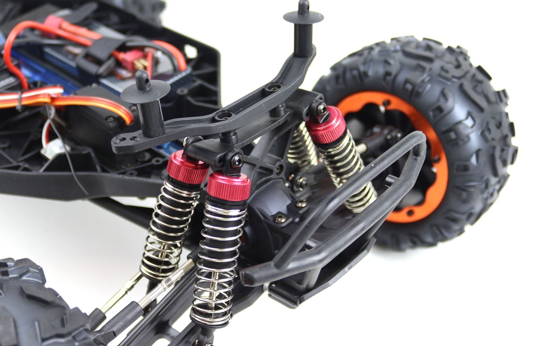 Данная модель - это полноприводный внедорожник. В комплект поставки входит пульт с радиусом действия 150 метров. Под корпусом установлен мощный бесколлекторный двигатель 3300kv, благодаря чему достигается надежность и мощность модели. Отлично подходит не только для езды на асфальтовых покрытиях, но и для сложных трасс с крутым рельефом. Рама имеет усиленную конструкцию, а в задней части установлен спур для предотвращения опрокидывания во время заездов на высокой скорости. Масштаб 1/8 при длине 56 см и весе в 2.86 кг делает эту машину на пульте очень зрелищной. Регулятор оборотов 60A и сдвоенные тяги с интегрированным сервосейвером в рулевом управлении обеспечивают точное и надежное маневрирование.
