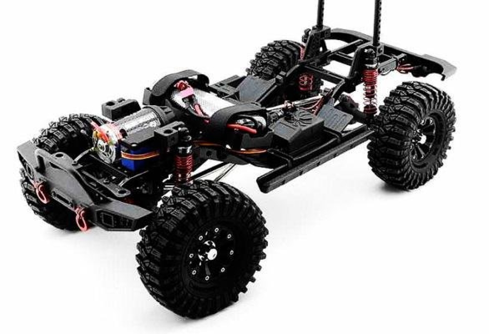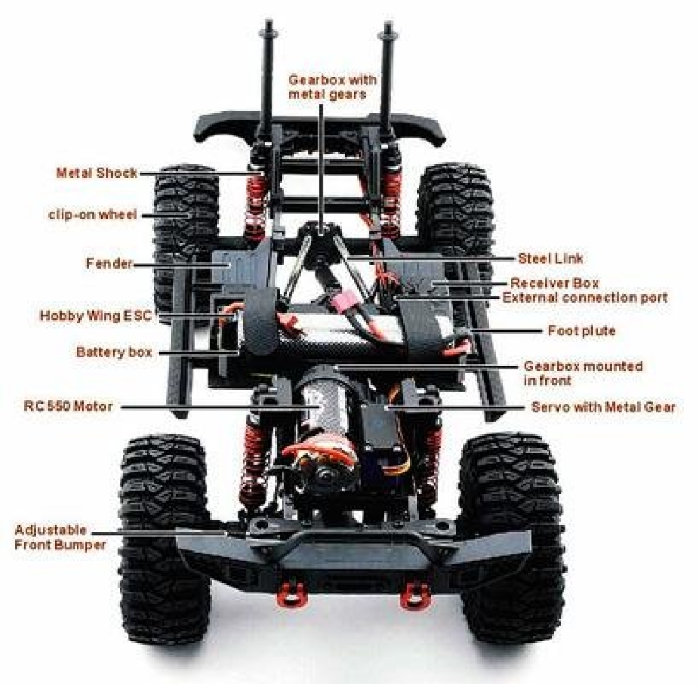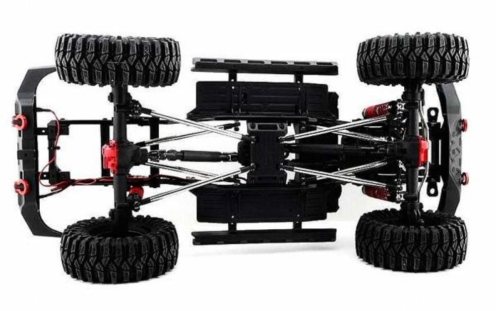 Радиоуправление помехозащищенное 2.4 ГГц, подвеска энергоемкая многорычажная. Мотор коллекторный - 17T RC550. Рама жесткая, сделана из металлического сплава, тяги из анодированного алюминия, кардан и крестовины из нейлонового композита. Постоянный полный карданный привод 4WD с дифференциалами из металла.