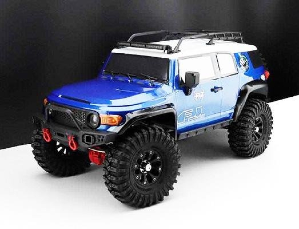 Электронный регулятор скорости с влагозащитой, сервопривод рулевого управления с защитой от воды и песка, трансмиссия защищена от попадания песка и камней. Вездеходные колеса с противоскользящим покрытием позволяют внедорожнику подниматься по склонам и преодолевать каменистые поверхности. Управление - пропорциональное. Корпус сине-белого цвета.