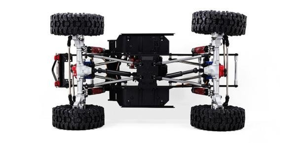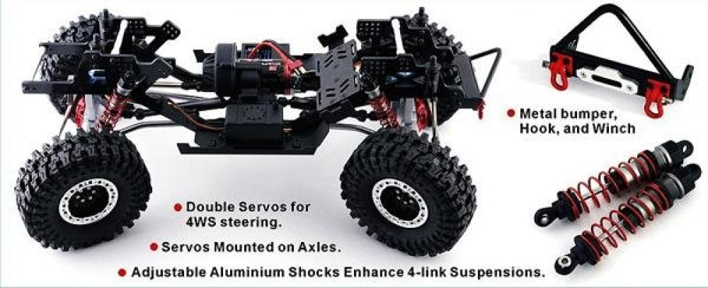 Радиоуправление помехозащищенное 2.4 ГГц, подвеска энергоемкая многорычажная. Мотор коллекторный - 20T RC550. Рама жесткая, сделана из металлического сплава, тяги из анодированного алюминия, кардан и крестовины из нейлонового композита. Постоянный полный карданный привод 4WD с дифференциалами из металла.