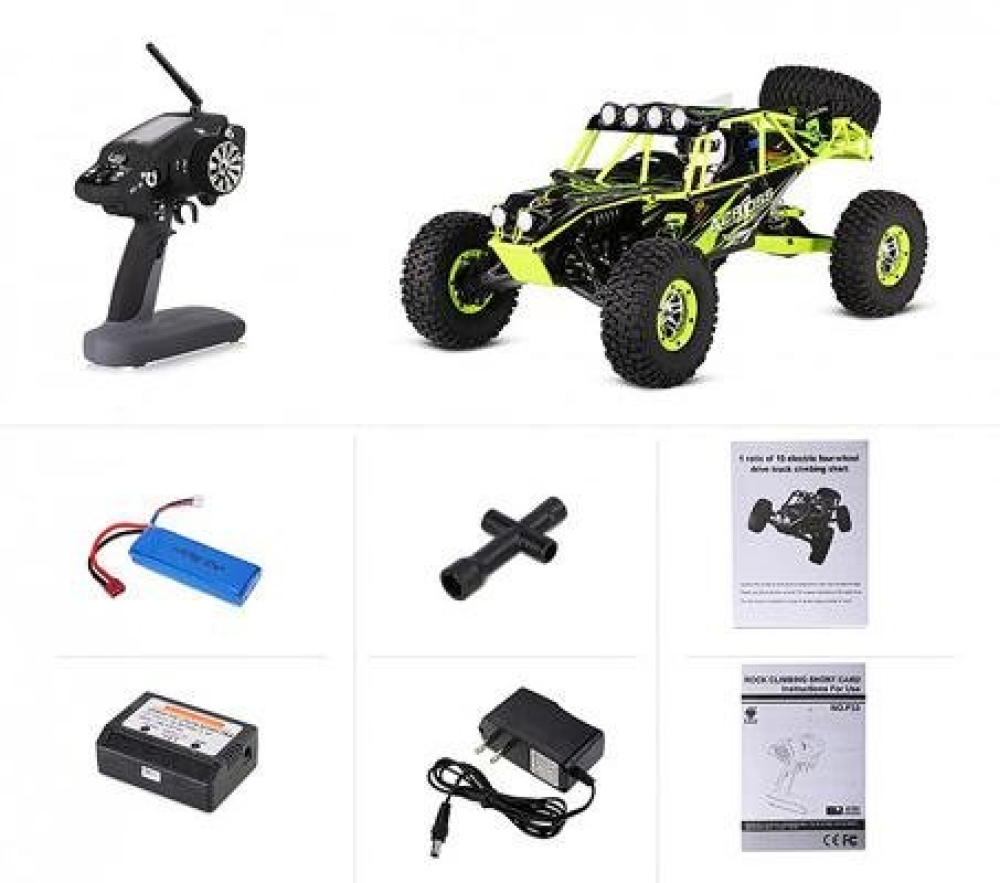 Комплект поставки: модель внедорожника, пульт управления, батарея, зарядное устройство, крестообразный торцевой ключ, инструкция