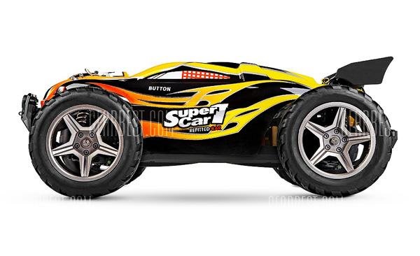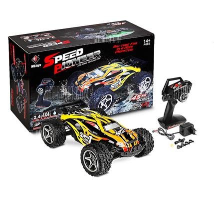 Радиоуправляемый багги от WL Toys. Масштаб 1:12, полный привод, мощный коллекторный мотор серии 540, есть защита от пыли и брызг. Скорость до 45 км/ч. Корпус чёрного цвета с оранжевыми и желтыми деталями.