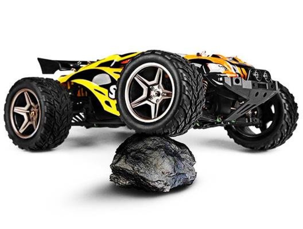 Независимая система подвески на каждом колесе позволяет модели устойчиво держаться на каменистых поверхностях и скалах. Шины из высококачественного каучука обеспечивают отличное сцепление с дорогой и не дают машине опрокинуться при движении. Корпус ударопрочный, влаго- и пылезащищенный.