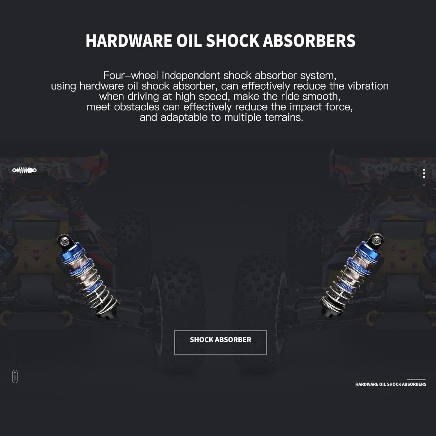 Данная багги является самой прочной моделью на сегодняшний день в стоковом исполнении. Модель имеет большое количество металлических элементов: амортизаторы, держатели амортизаторов, рычаги, стабилизаторы, шестерни и дифференциалы, а самое главное - алюминиевая пластина шасси. Это делает модель чрезвычайно крепкой. Лобовые столкновения даже в сильный мороз не будут проблемой, машинка не сломается пополам даже на скорости 75 км/ч. Специальная резина позволяет кататься на любом типе поверхности от асфальта до гравия. Машину можно использовать в любую погоду, в грязь, дождь и снег.
