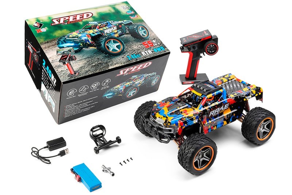 Собранная радиоуправляемая машинка, пульт управления, аккумулятор, зарядное устройство, крестообразный ключ, инструкция