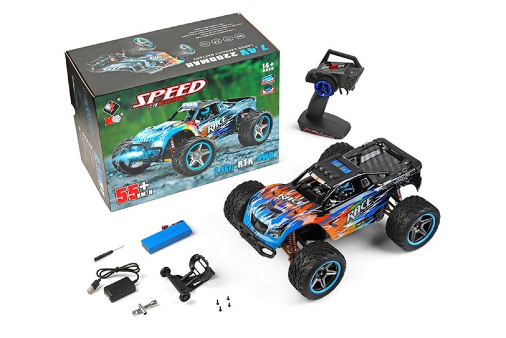 Собранная радиоуправляемая машинка, пульт управления, аккумулятор, зарядное устройство, крестообразный ключ, инструкция
