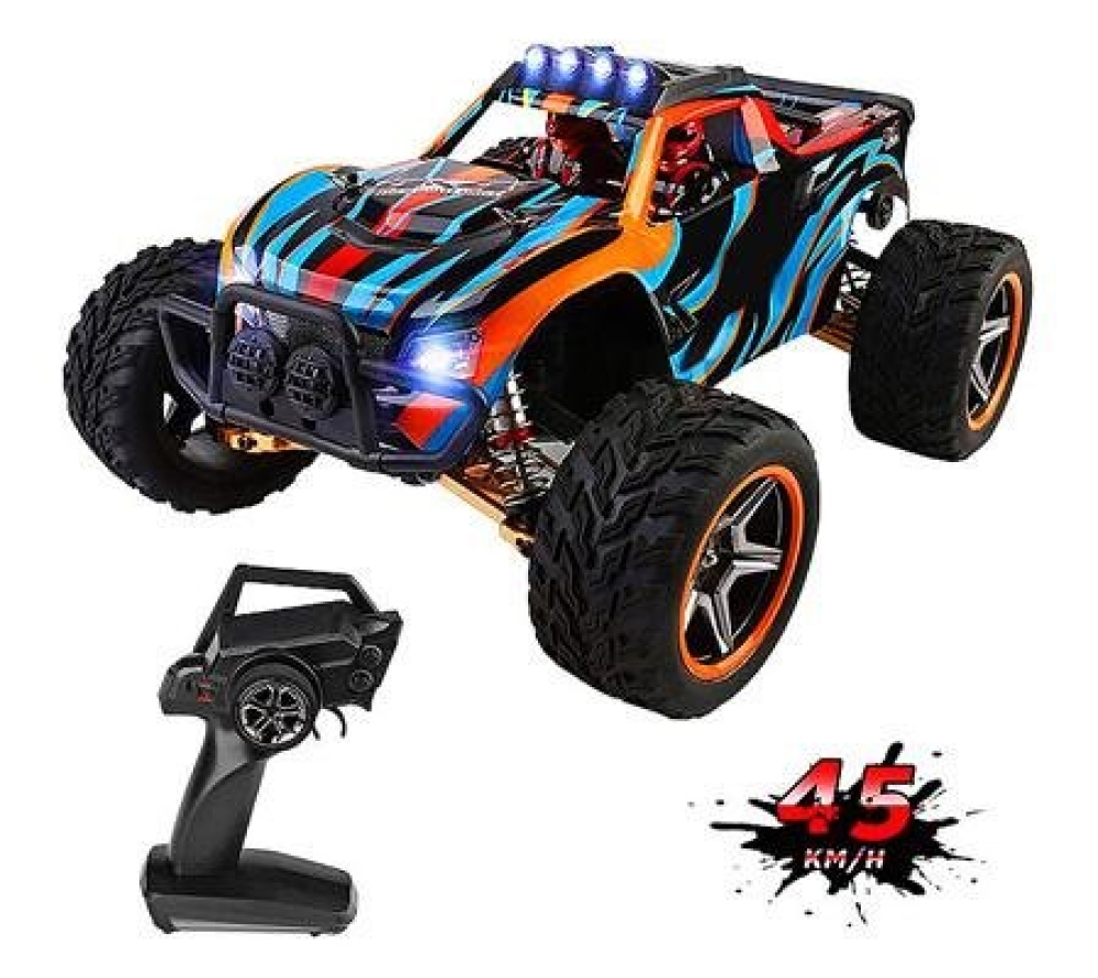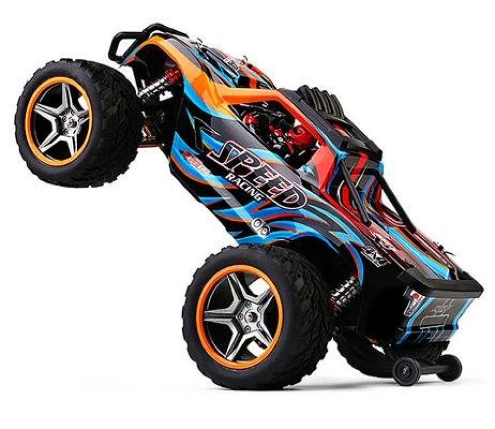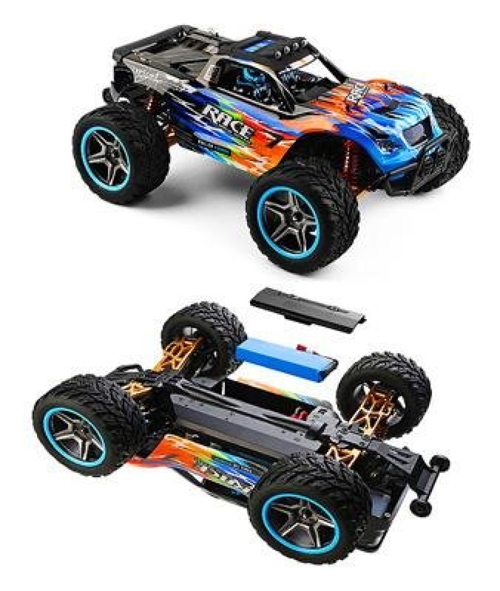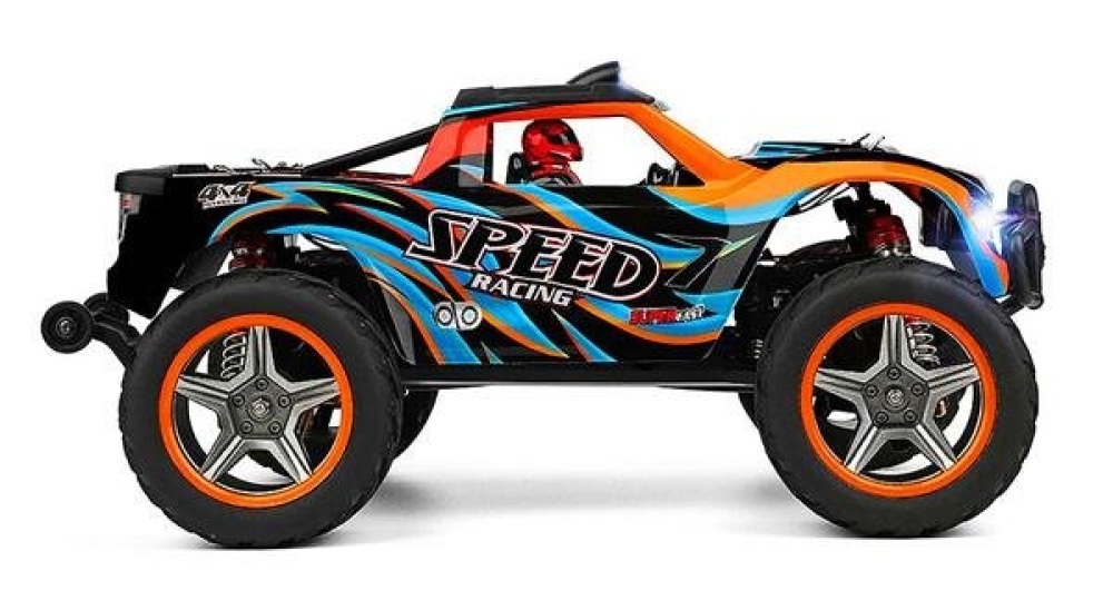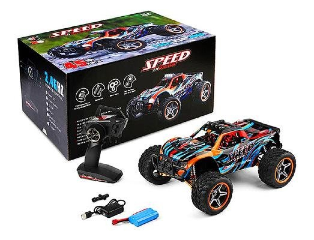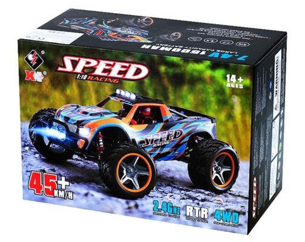 Радиоуправляемый внедорожник Wltoys BIGFOOT 4WD 1:10 - WLT-104009 - популярная машинка-монстр от компании HSP. Несмотря на то что машинка входит в бюджетный сегмент, она отличается удобным управлением и экономичным энергопотреблением, сохраняя при этом отличные ходовые характеристики. Полный привод 4WD, масштаб 1:10, мощный электрический мотор 540 класса, маслонаполненные амортизаторы и лёгкий корпус из пластика повышенной прочности - это основные особенности данной модели. В комплектации идут все необходимые устройства и аксессуары, позволяющие запустить машинку прямо из коробки. Вам потребуется только полностью зарядить её аккумулятор. Цвет корпуса модели - чёрно-синий с серыми и жёлтыми элементами.