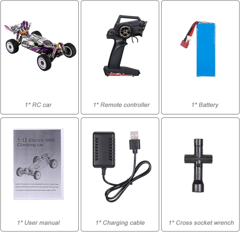 Собранная радиоуправляемая машинка, пульт управления, аккумулятор, зарядное устройство, крестообразный ключ, инструкция