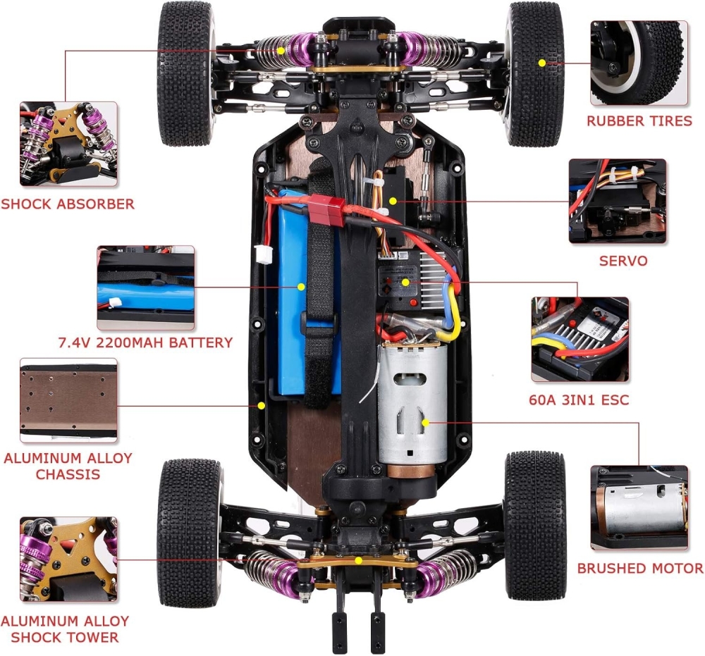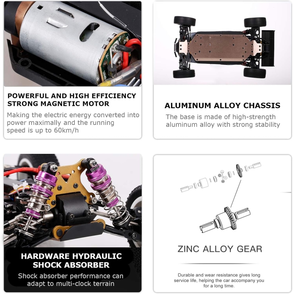 Модель имеет в стоке большое количество металлических элементов: амортизаторы, держатели амортизаторов, рычаги, стабилизаторы, шестерни и дифференциалы, а самое главное - алюминиевая пластина шасси толщиной 2мм. Это делает модель чрезвычайно крепкой. Лобовые столкновения даже в сильный мороз не будут проблемой, машинка не сломается пополам даже на скорости 60 км/ч. Специальная резина позволяет кататься на любом типе поверхности от асфальта до гравия. Машину можно использовать в любую погоду, в грязь, дождь и снег. Машинка имеет низкий центр тяжести, что позволяет ей проходить крутые повороты на максимальной скорости.