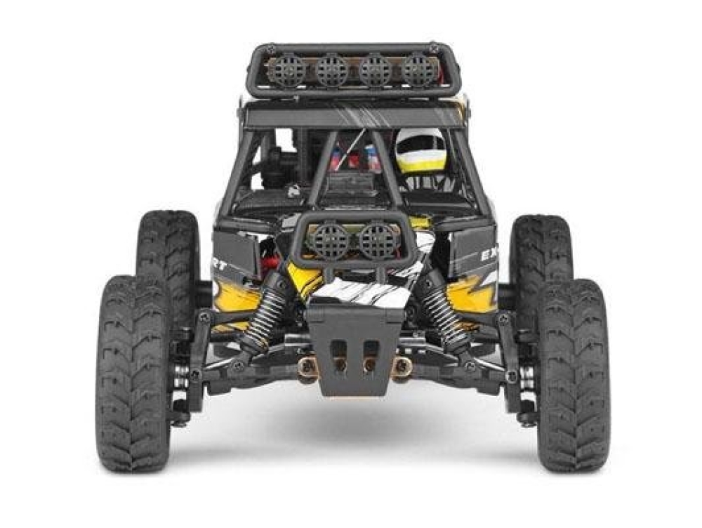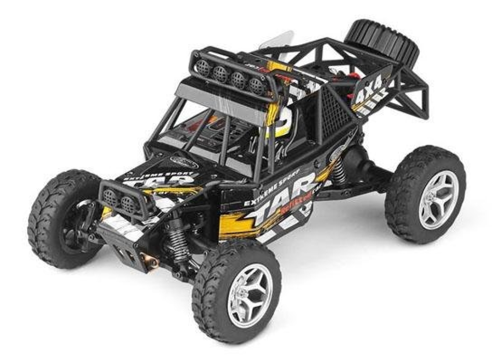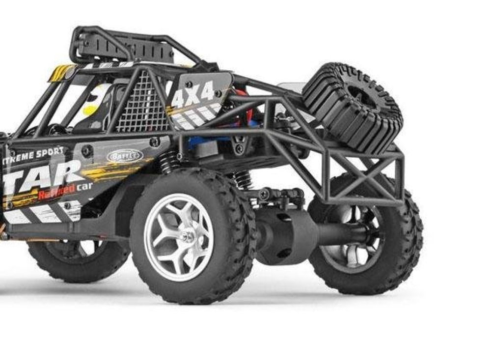 Хит продаж! Самая популярная и надежная багги от WLToys. Идет в двух цветах - ярко зеленом и черно-желтом. Кузов выполнен на прочных трубок, которые образую рамы. На крыше установлено светодиодное освещение, которое можно включать и выключать с пульта управления. Подвеска выполнена не стандартных образом: передняя имеет классические независимые рычаги с амортизаторами, которые расположены горизонтально, распределяя энергию. Задняя подвеска полузависимая с балкой, внутри которой расположен мощный металлический дифференциал. Т.к. большая мощь подается именно на заднюю ось для лучшего старта. Полный привод осуществляется через систему карданных валов, которые соединяются через стальные шарниры с подшипниками. В передней части машинки имеется стальная пластина для придания дополнительной прочности, т.к. именно передняя часть принимает на себя основные удары.