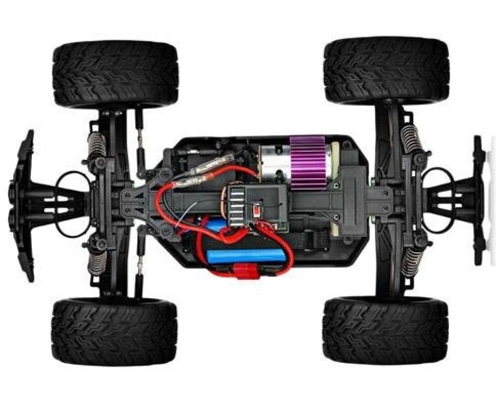 Модель выполнена в среднем масштабе 1/12 и имеет ряд преимуществ по сравнению с другими машинками в этом ценовом диапазоне. Оснащается металлическими рулевыми тягами, которые можно регулировать. Нижние рычаги подвески устанавливаются усиленные, поэтому вы спокойно можете разгоняться и прыгать с трамплинов. Передний и задний бамперы имеют амортизирующие проставки. Для заездов в дождь предусмотрена влагозащита электроники и основных узлов, как механических, так и электронных. Подвеска машинки мягкая, чтобы без проблем ездить по камням и ухабам, для прочности имеет стальные приводы колес.