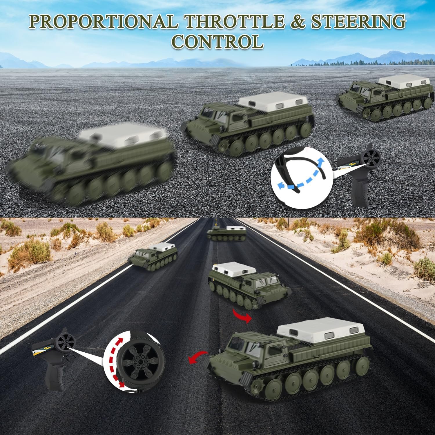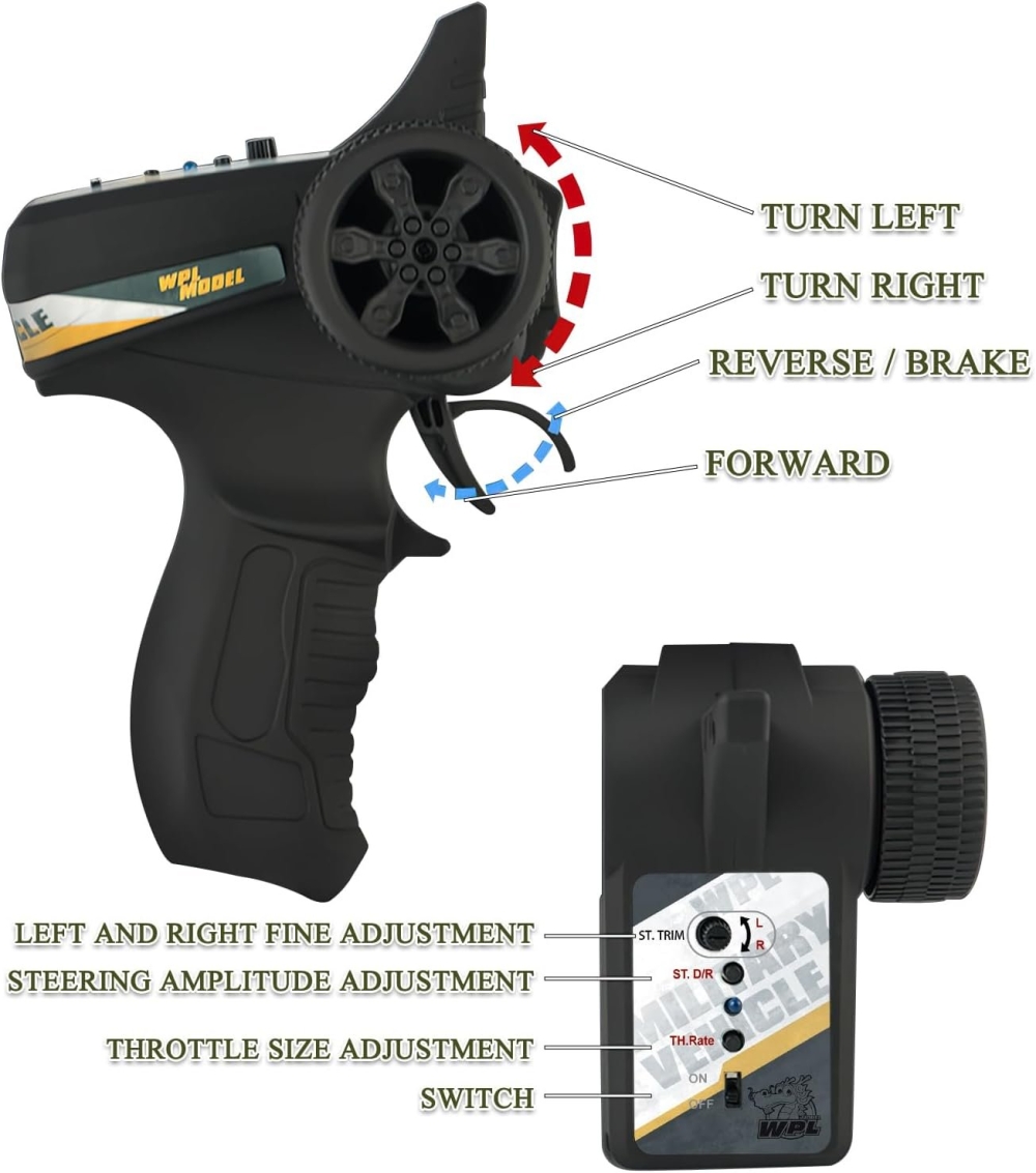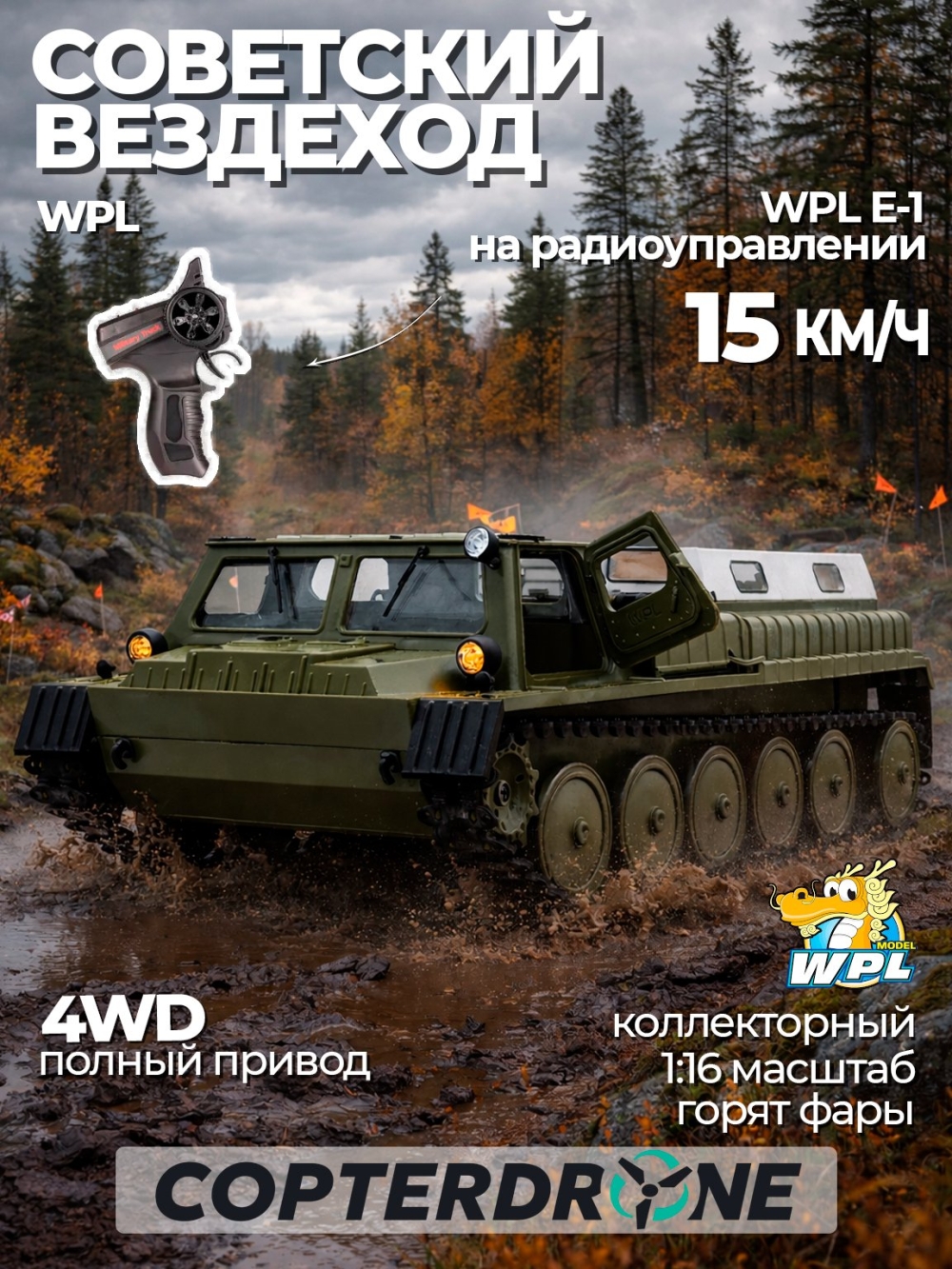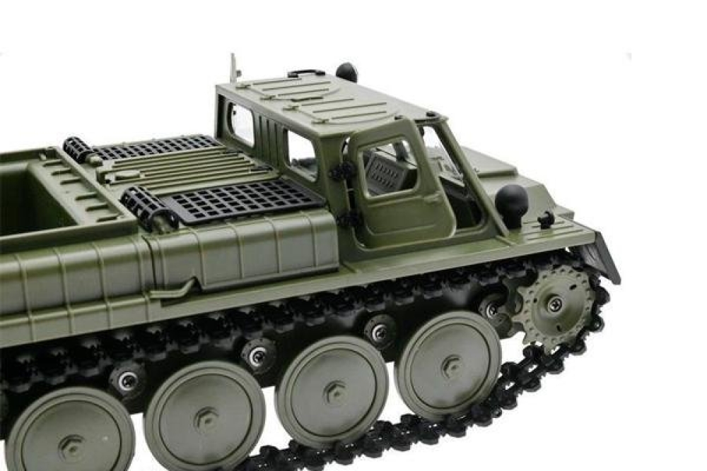 Вездеход двигается вперед/назад, поворачивает вправо и влево, как любая модель. Вращение на 360 градусов на месте также доступно для WPL E-1, что делает его очень маневренным. Вездеход способен развивать скорость более 15 км/ч. Двухгребневая гусеница выполнена одной лентой и не спадает при езде. Все опорные катки двигаются. Модель имеет открывающиеся двери, поэтому можно рассмотреть кабину и место водителя. В задней части расположен тент, который можно легко снять для перевозки различных грузов.
