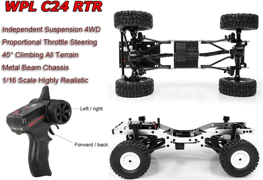Полноприводный краулер WPL Military Truck Buggy Crawler 4WD 1:16 отличается не только ярким дизайном и детализированными кузовом и салоном, но и превосходными ходовыми и техническими характеристиками. Машинка, выполненная в масштабе 1:16, оснащена мощным коллекторным мотором, длинноходной подвеской, неразрезными мостами с дифференциалами, а также мягкими резиновыми шинами, обеспечивающими дополнительную устойчивость в условиях бездорожья. Маневренный краулер покоряет каменистые поверхности, участки с неровным рельефом на скорости до 10 км/ч. Удобный пульт управления действует в радиусе до 150 м, аккумулятор 500 мАч обеспечивает до 15-25 минут запуска машинки на одном заряде. Краулер также оснащен зажигающимися при движении фарами. Конструкция машинки предусматривает возможность снятия задней части кузова.