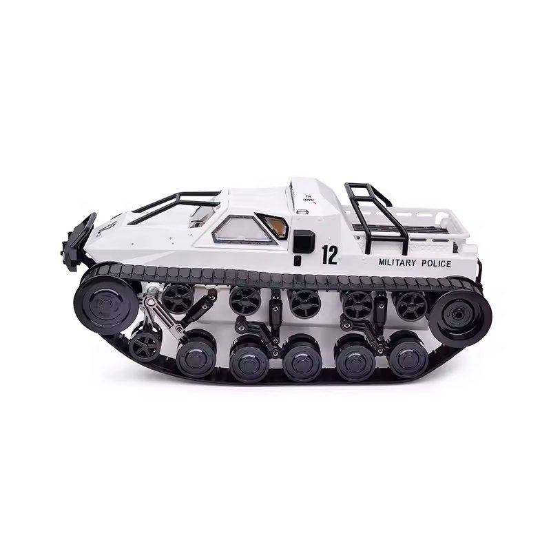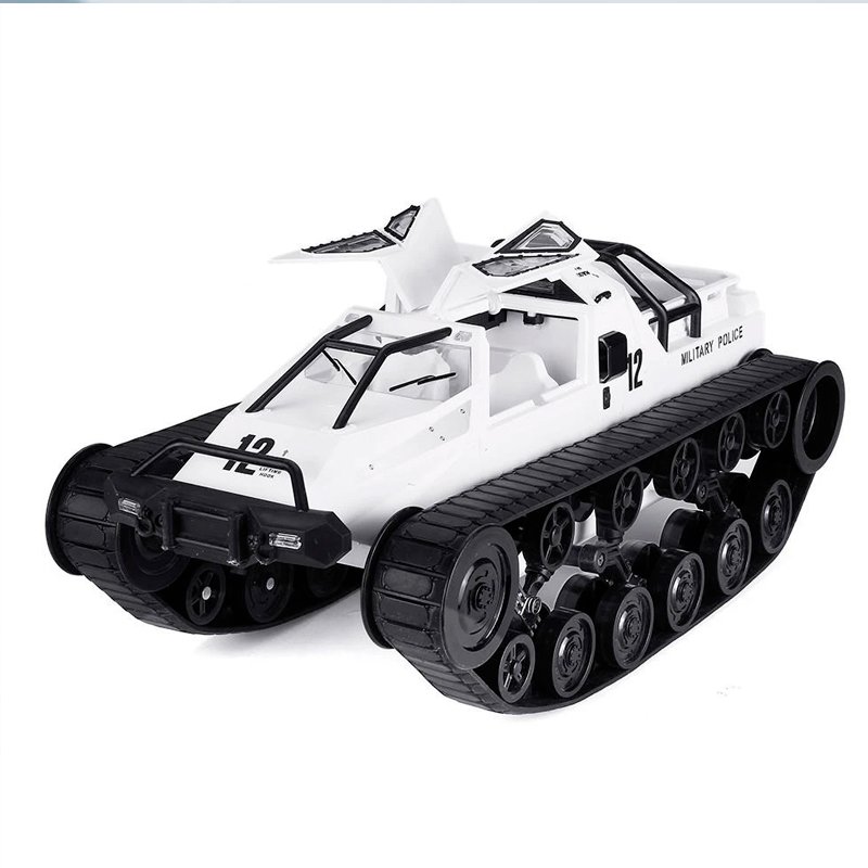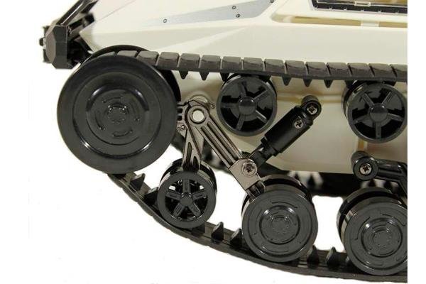 Этот гусеничный вездеход амфибия способен преодолевать пересечённую местность там, где не проедет не один полноприводный автомобиль. Оснащен амортизаторами и поэтому вездеход плавно преодолевает любого рода насыпи из камней, палок и так далее. Оснащен усиленной рамой, что придает прочности всей конструкции, кабина выполнена в очень высокой детализации, вы можете открыть двери и заглянуть в кабину. Несмотря на то что данная машинка игрушка является практически танком, она имеет достаточно высокую скорость и разгоняется до 12 км/ч. На вездеход установлен емкий аккумулятор на 1200 mah, а время игры составят более 20 минут. Пульт управления 2.4 ГГц имеет дальность управления машины до 100 м. В зависимости от типа дорожной поверхности Вы можете регулировать натяжение гусениц для большей проходимости, максимальный угол подъема составляет 30 градусов.