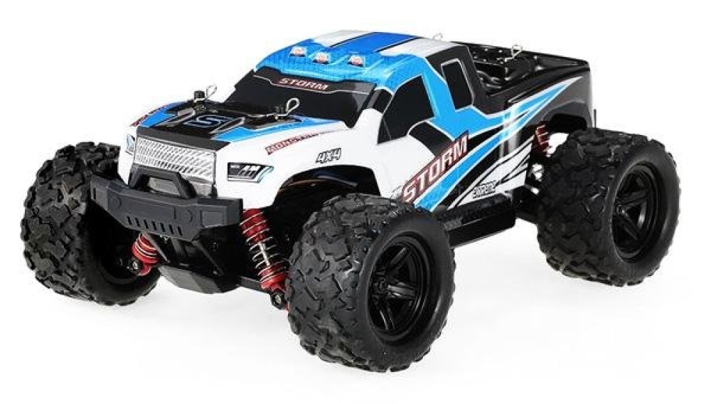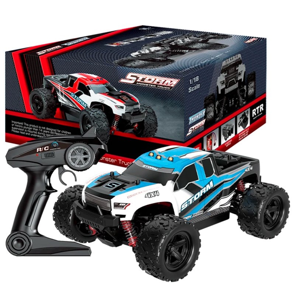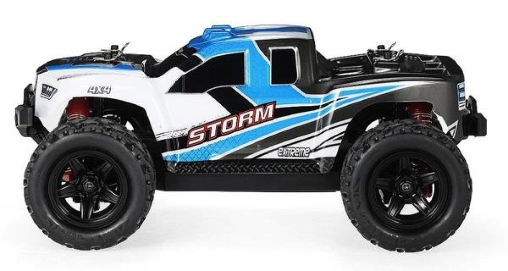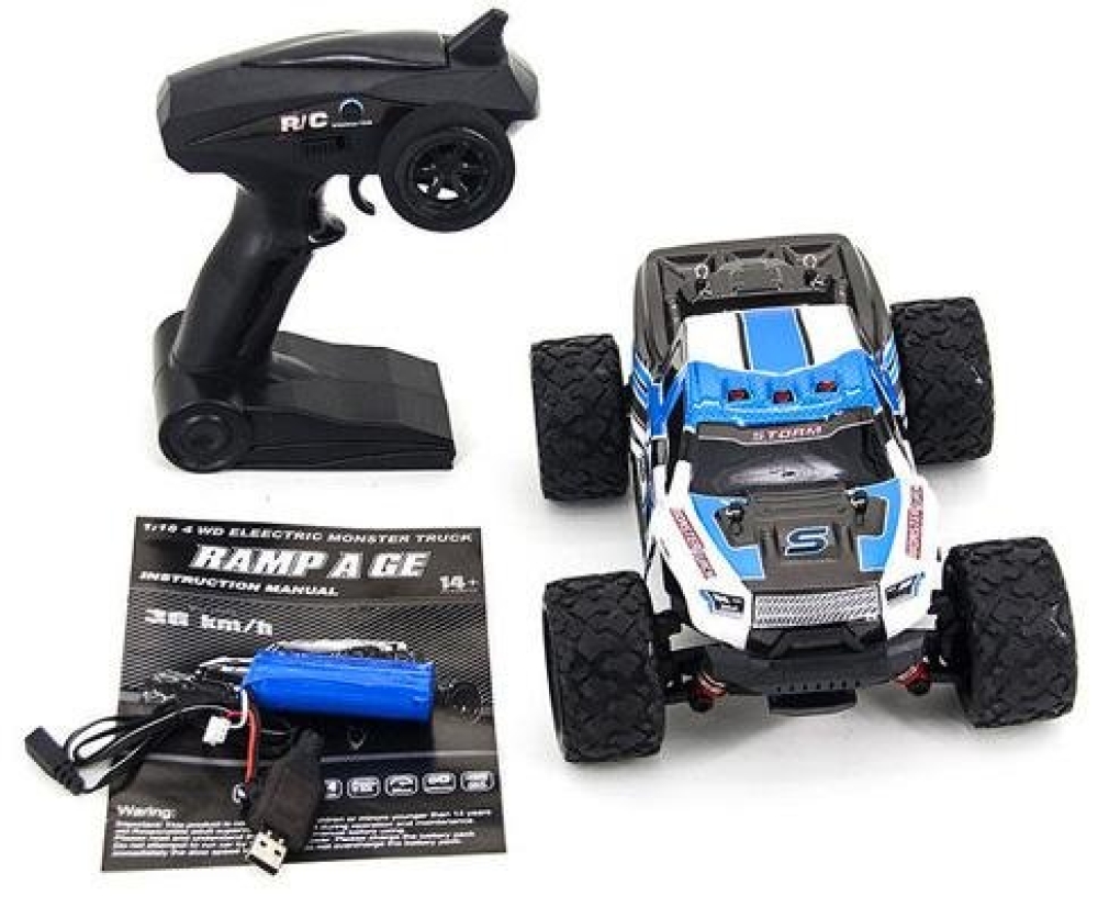 Радиоуправляемый внедорожник Zegan Thunder Storm 4WD HS18302 – это необычная и легкая полноприводная модель масштаба 1:18, способная разогнаться до скорости 36 км/ч. Управление - пропорциональное. В модель установлен коллекторный двигатель RC380 и литий-ионный аккумулятор. От ударов машинку и электронные компоненты защищают надежный прочный корпус и независимая пружинная подвеска, также обеспечивающая машинке улучшенное сцепление с дорогой. Пульт управления и передатчик работают на частоте 2,4 ГГц, что исключает пересечение частот с пультами других моделей. Корпус машинки голубого цвета с черными и белыми вставками.