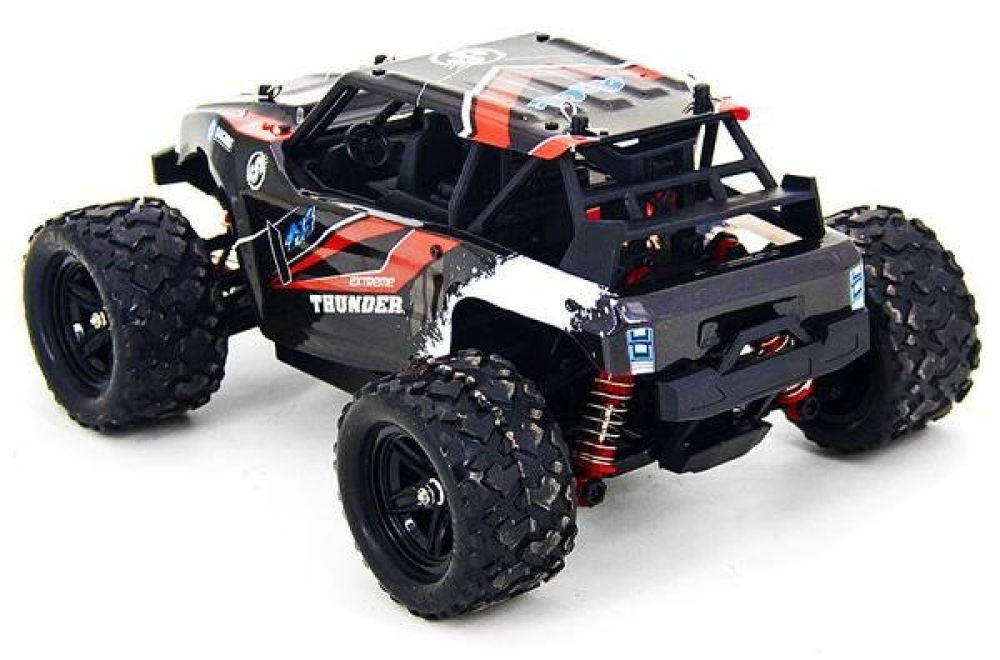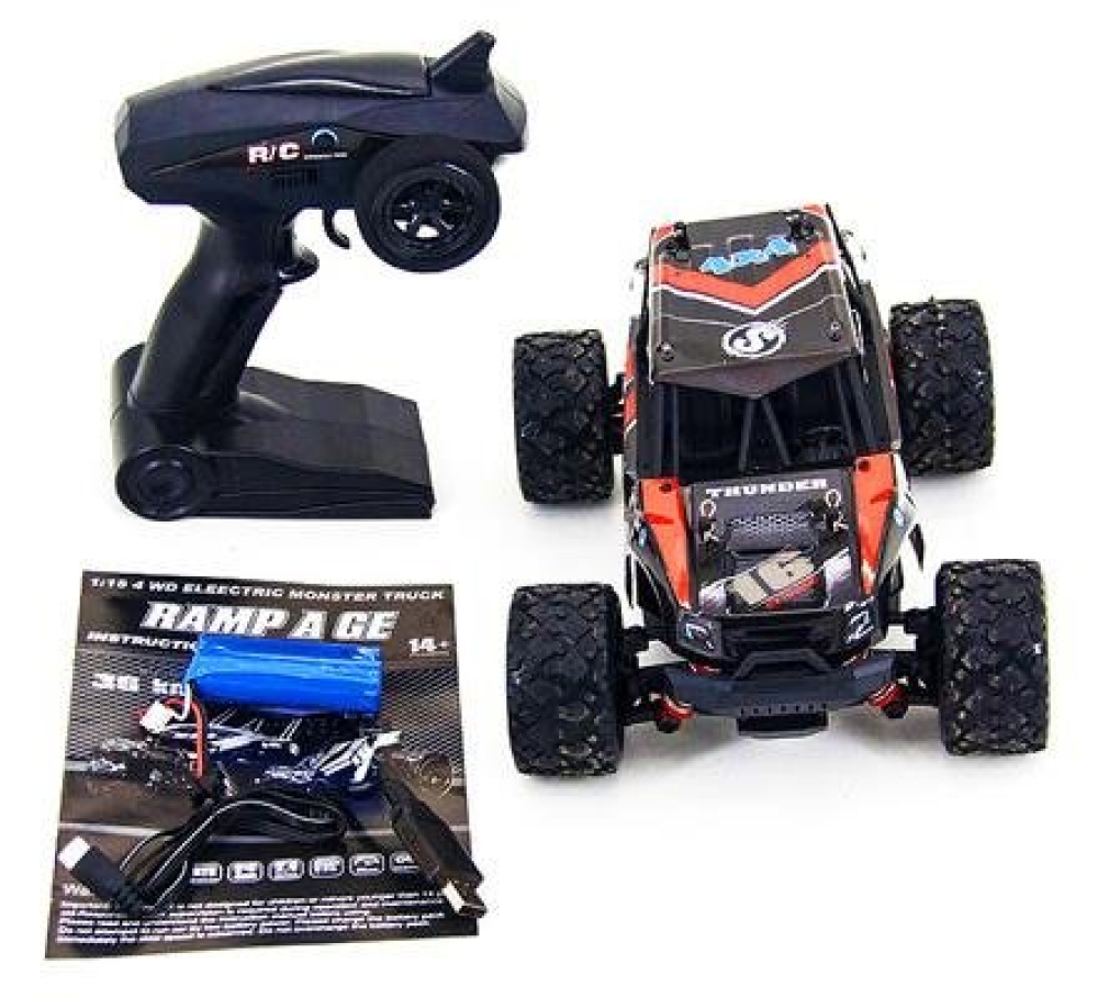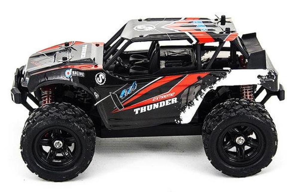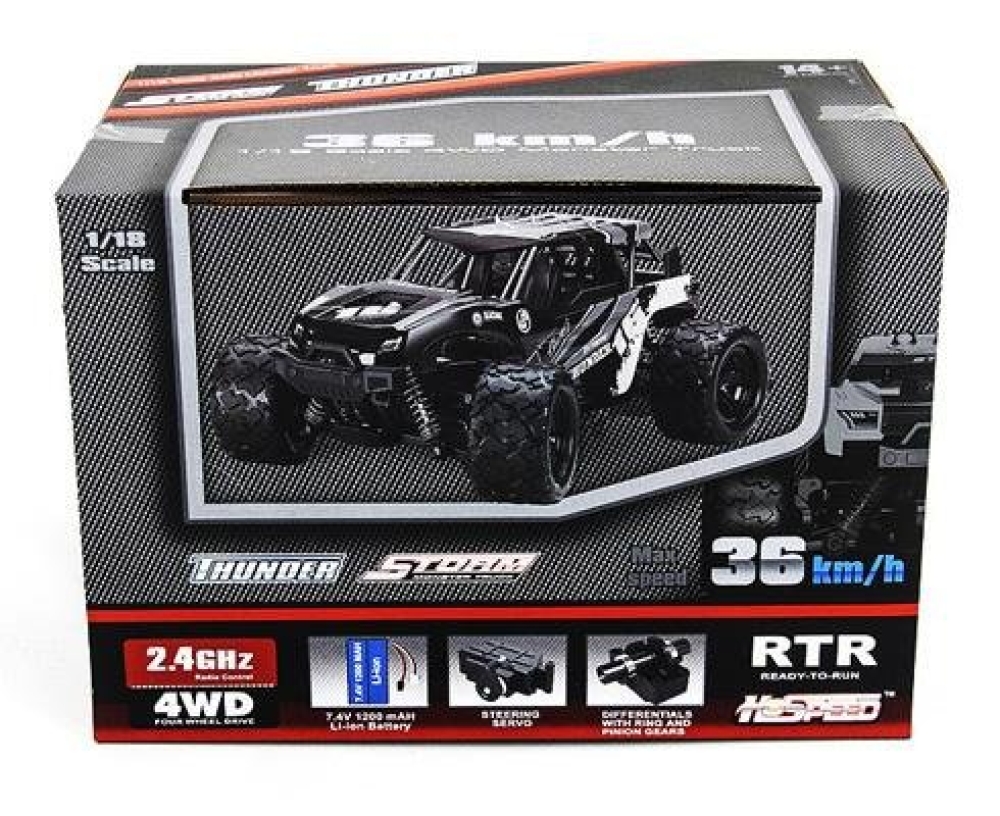 Радиоуправляемый внедорожник Zegan Thunder Storm 4WD HS18311 – это необычная и легкая полноприводная модель масштаба 1:18, способная разогнаться до скорости 36 км/ч. Управление - пропорциональное. В модель установлен коллекторный двигатель RC380 и литий-ионный аккумулятор. От ударов машинку и электронные компоненты защищают надежный прочный корпус и независимая пружинная подвеска, также обеспечивающая машинке улучшенное сцепление с дорогой. Пульт управления и передатчик работают на частоте 2,4 ГГц, что исключает пересечение частот с пультами других моделей. Корпус машинки чёрно-красного цвета.