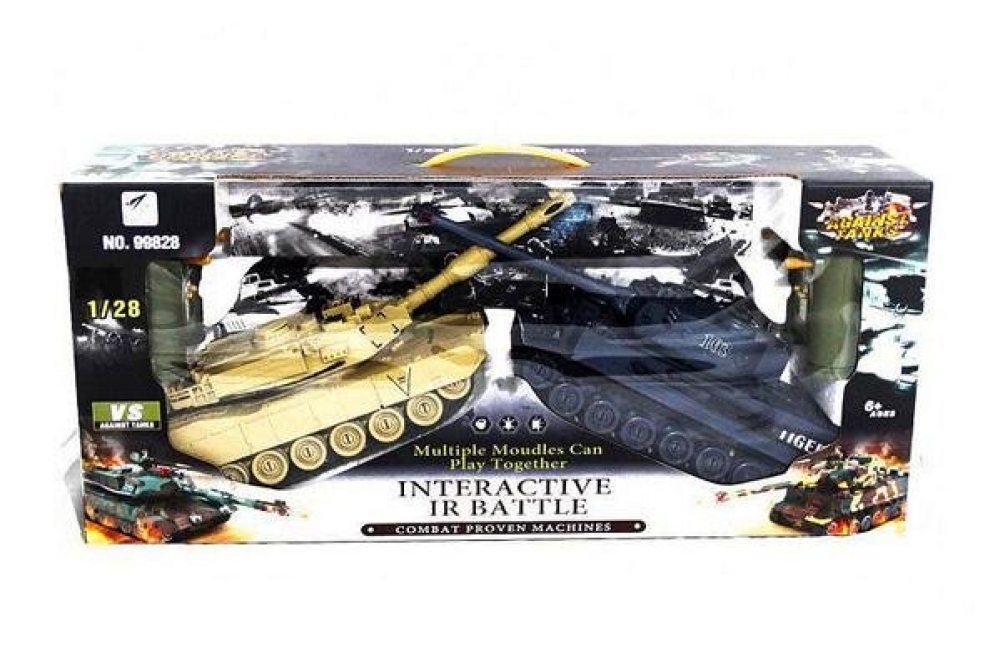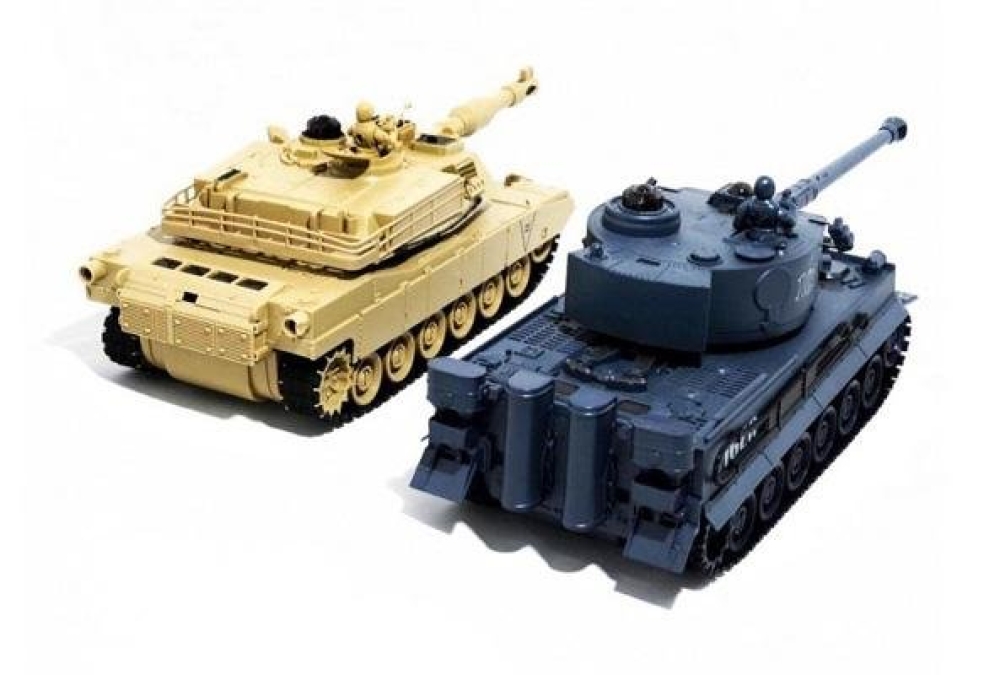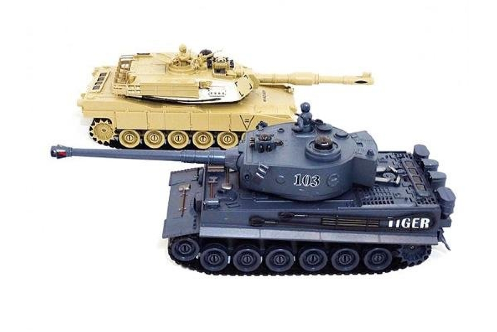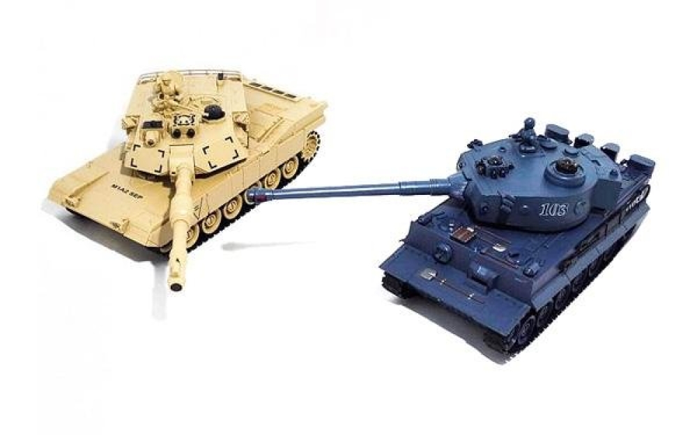 Танковый бой в форме противостояния M1A2 (модификация Абрамса) и немецкого Тигра. Угол обзора попадания выстрелом - 10 градусов на расстоянии до 3-х метров. Танки ездят на гусеницах во всех направлениях, каждая гусеница управляется отдельно. За счет этого оба танка могут разворачиваться на 360°. Башня вращается, пушку можно поднять или опустить прямо на ходу танка. Задача игры - 5 раз успешно попасть по противнику, кто первый достиг цели - тот и выиграл. Обе модели выполнены с высокой степенью детализации башни, корпуса с навесными элементами и гусениц. Материал из которого изготовлены модели - пластик.