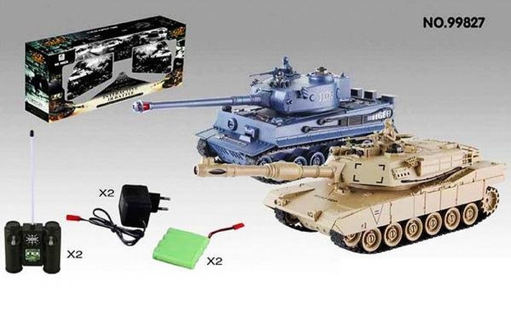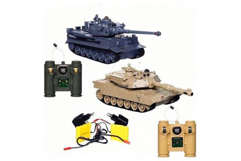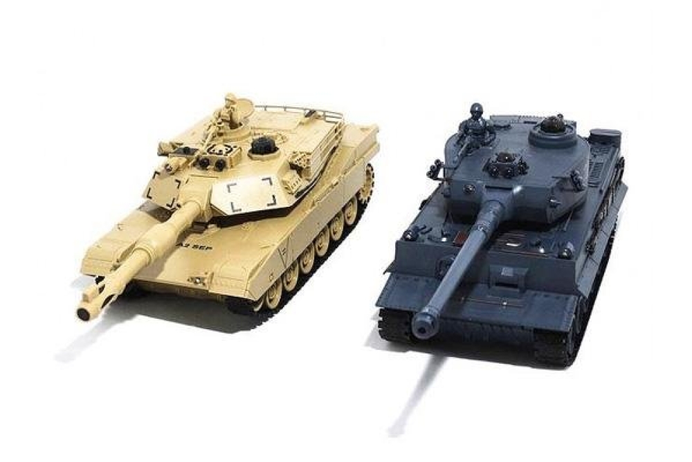 В комплекте: 2 танка (M1A2 и German Tiger), 2 аккумулятора 4.8v 700mAh, 2 зарядных устройства, 2 пульта, инструкция.