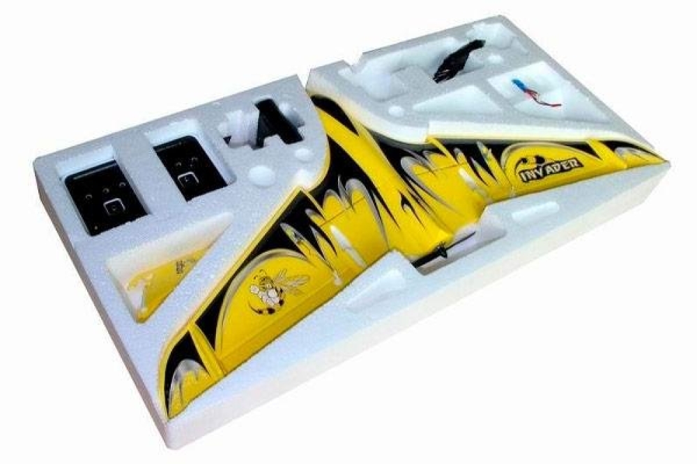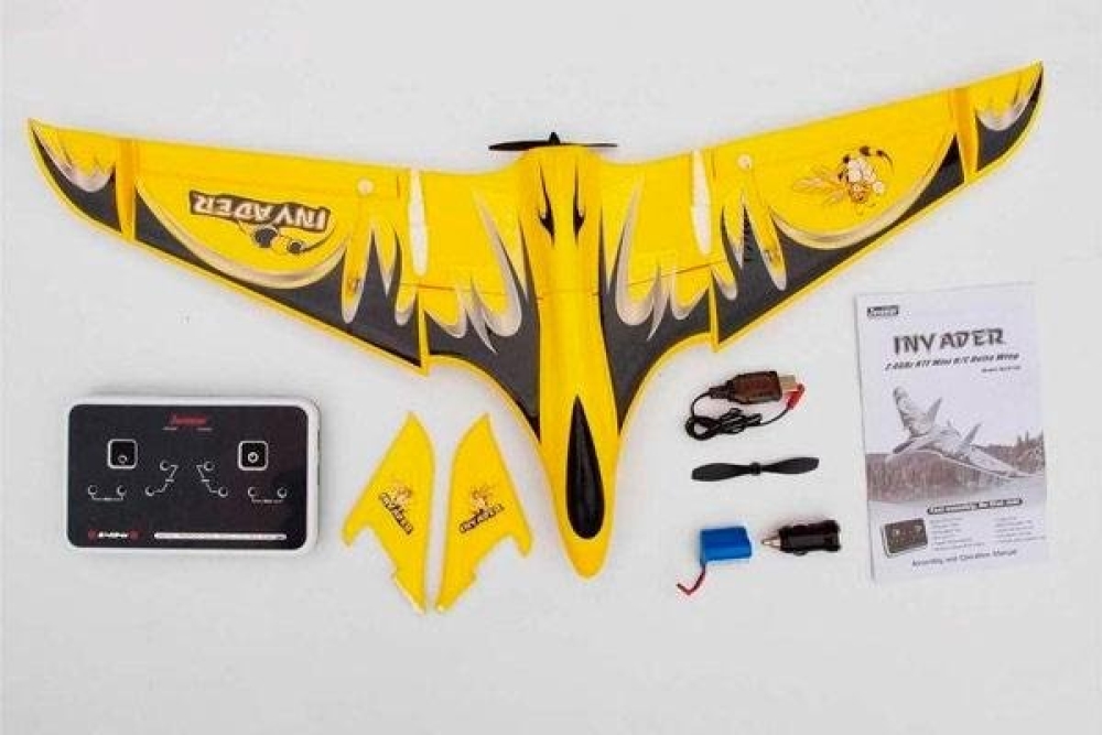 Самолет Joysway Invader – это один из немногих моделей в своем роде, которые позволяют обучаться и подходит для развлекательный целей. Учитывая размах крыла 720 мм, он спокойно может парить на высоте и практически не расходовать заряд аккумулятора. Желто-черный цвет не даст вам упустить из виду достаточно быстрый аппарат. Его полетный вес составляет всего 125 грамм, сделан он из гибкого, но очень крепкого материала EPO. Дальность управления планером составляет более 200 метров, время полета более 8 минут, в случае планирования более часу. В модель установлен достаточно емкий литий-полимерный аккумулятор, а так же коллекторный двигатель 180 класса. Аппарат полностью собранный и готовый к полетам. В комплектацию входит: самолет в сборе, аккумулятор, пульт дистанционного управления, зарядное устройство. Батарейки типа АА в количестве 4 штук для пульта нужно будет докупить.