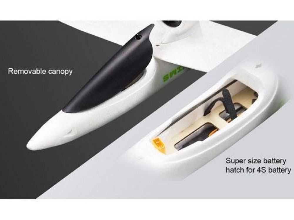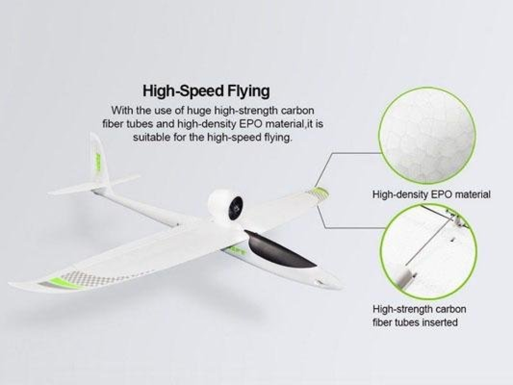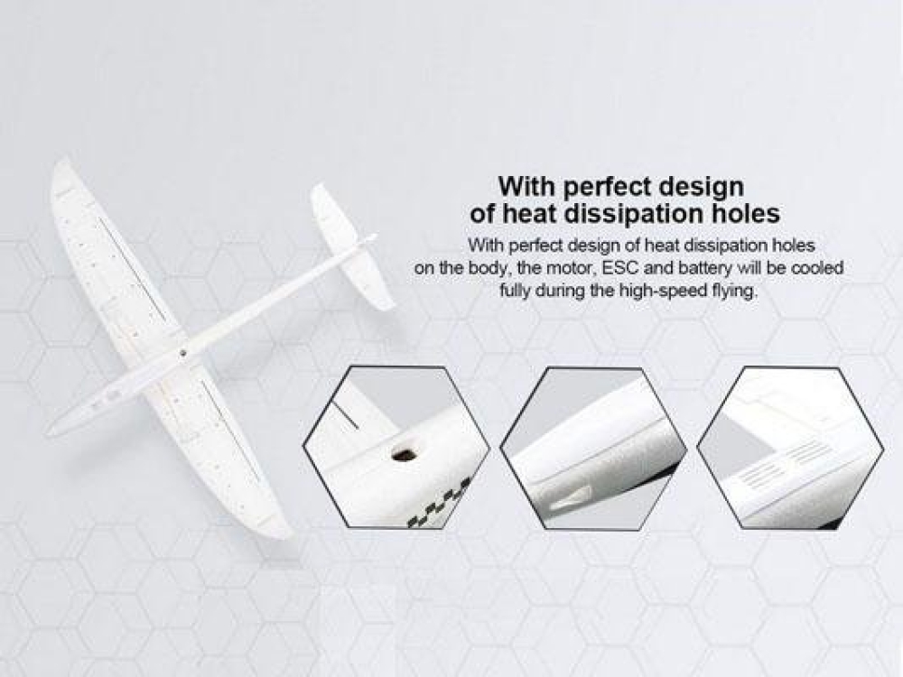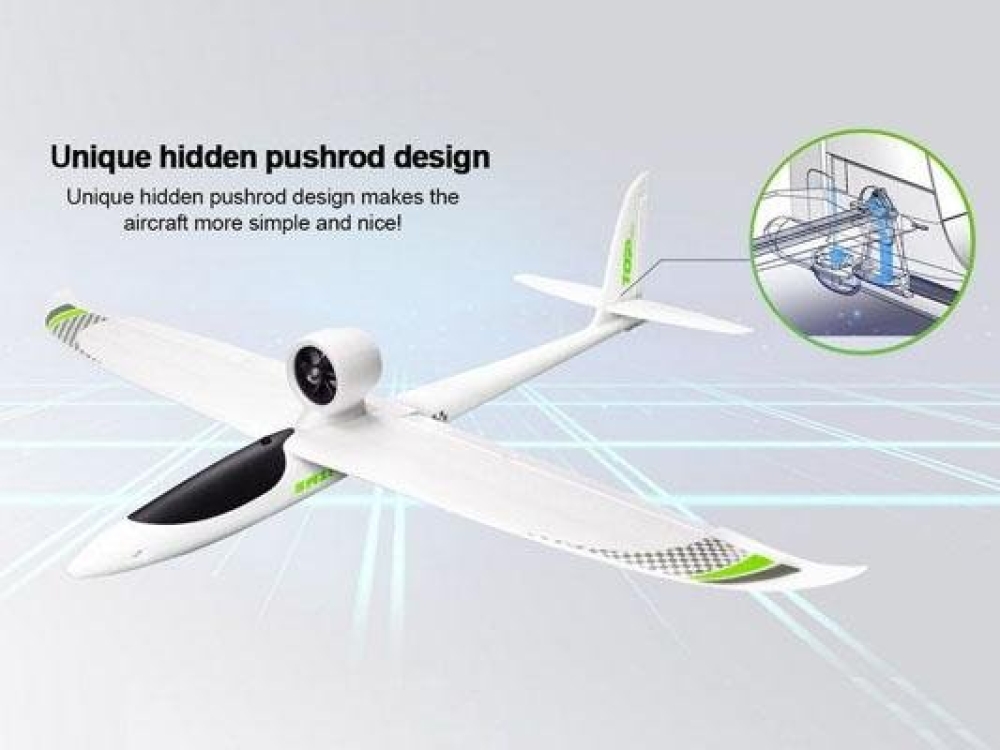 Средне размерный планер с уникальными особенностями. Мотор спрятан в защитный кожух EDF и отлично защищает его от различного рода повреждений. Верхнее расположение крыла и двигателя делают взлет и посадку безопасными. Нижняя часть фюзеляжа, хвостовая часть и наконечники крыльев имеют дополнительные защитные пластины, так что экстренная посадка на асфальт не станет проблемой. Модель самолета изготовлена из высокоплотного EPO материала. Вдоль всего корпуса расположены специальные отверстия воздухозаборники для эффективного охлаждения электронных компонентов. Под быстросъемной крышкой кабины располагается место для аккумулятора, которое способно вместить батареи вплоть до 4s. За счет мощного бесколлекторного мотора самолет способен развить скорость до 160 км/ч!