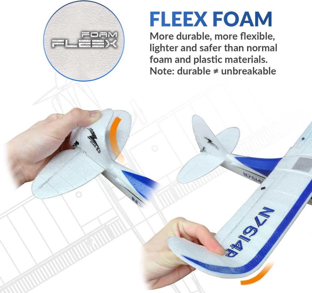 Материал: Конструкция из вспененного полипропилена (EPP) делает планер легким, гнущимся, но не ломающимся, что обеспечивает устойчивость к повреждениям при посадке и столкновении. Конструкция толкателя, направленного назад, защищает воздушный винт от удара, так что его нелегко повредить.