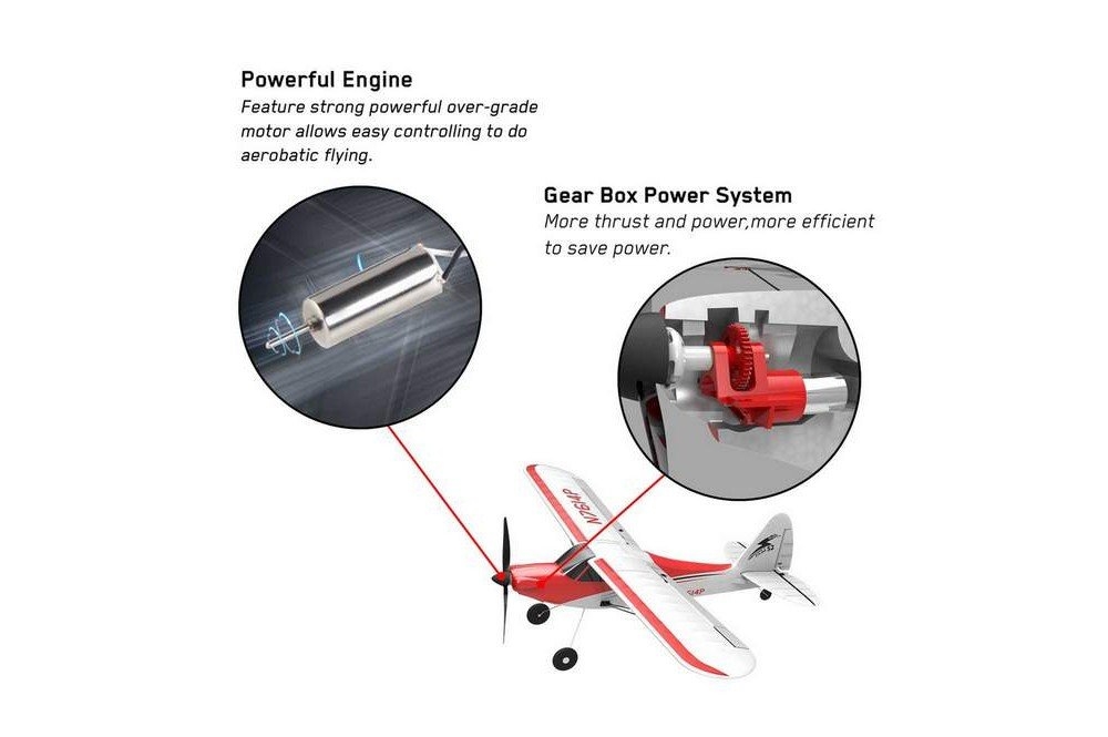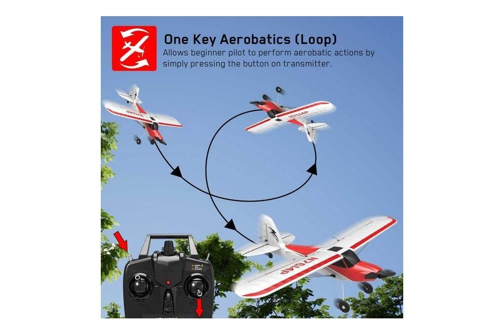 Высший пилотаж: Функция “flip” and “roll” означает, что самолет-тренер может автоматически выполнять фигуры высшего пилотажа в двух направлениях. Если вы установите его в режиме для начинающих, просто нужно нажать кнопку высшего пилотажа, а затем повернуть правый джойстик в максимальное положение или вниз до минимального положения. Получить удовольствие от пилотажного полета сможет любой желающий, даже если он - новый пилот.