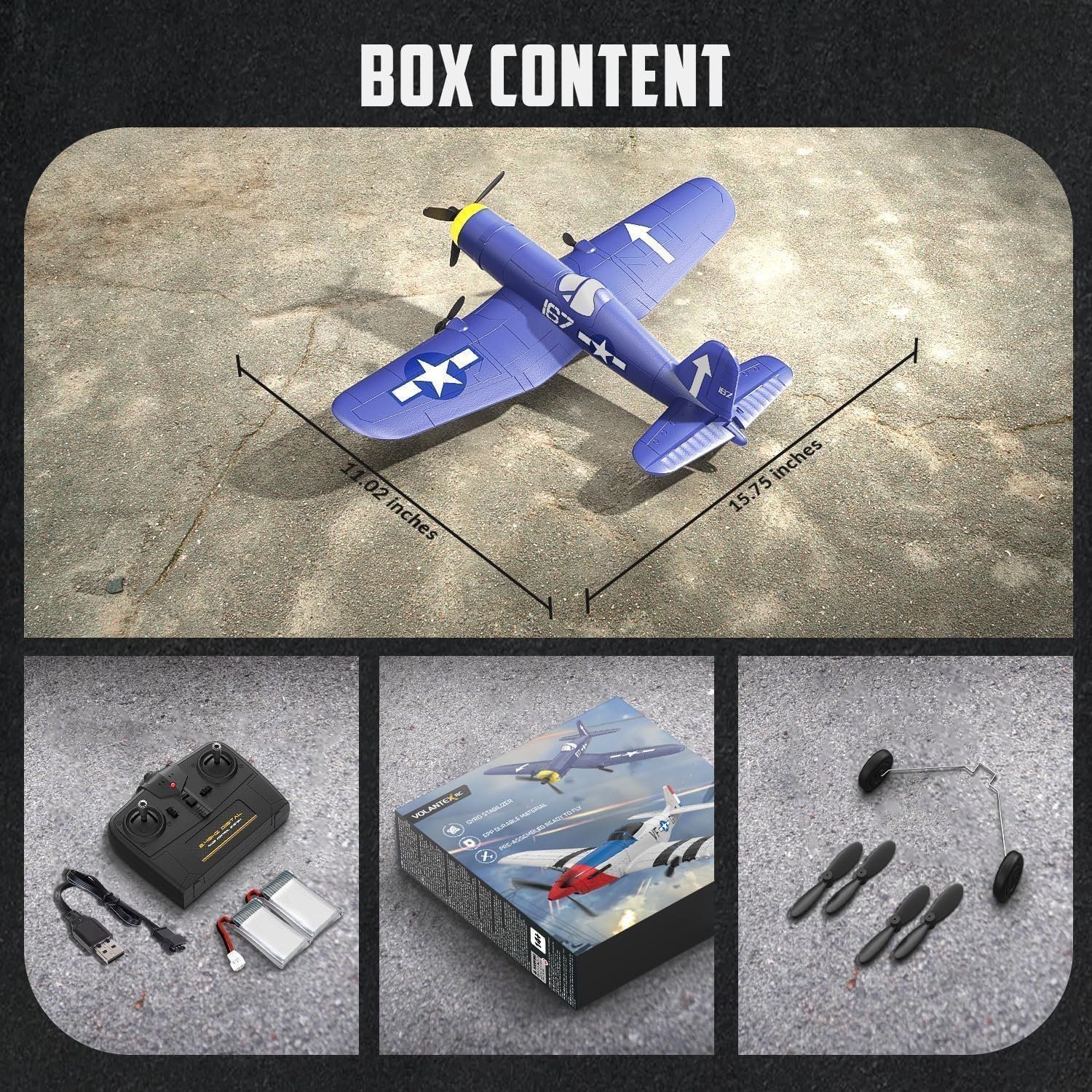 Комплект поставки: комплект самолета Volantex RC F4U Corsair RTF с электроникой и серво, пульт управления, аккумулятор, запасные аксессуары, инструкция по эксплуатации