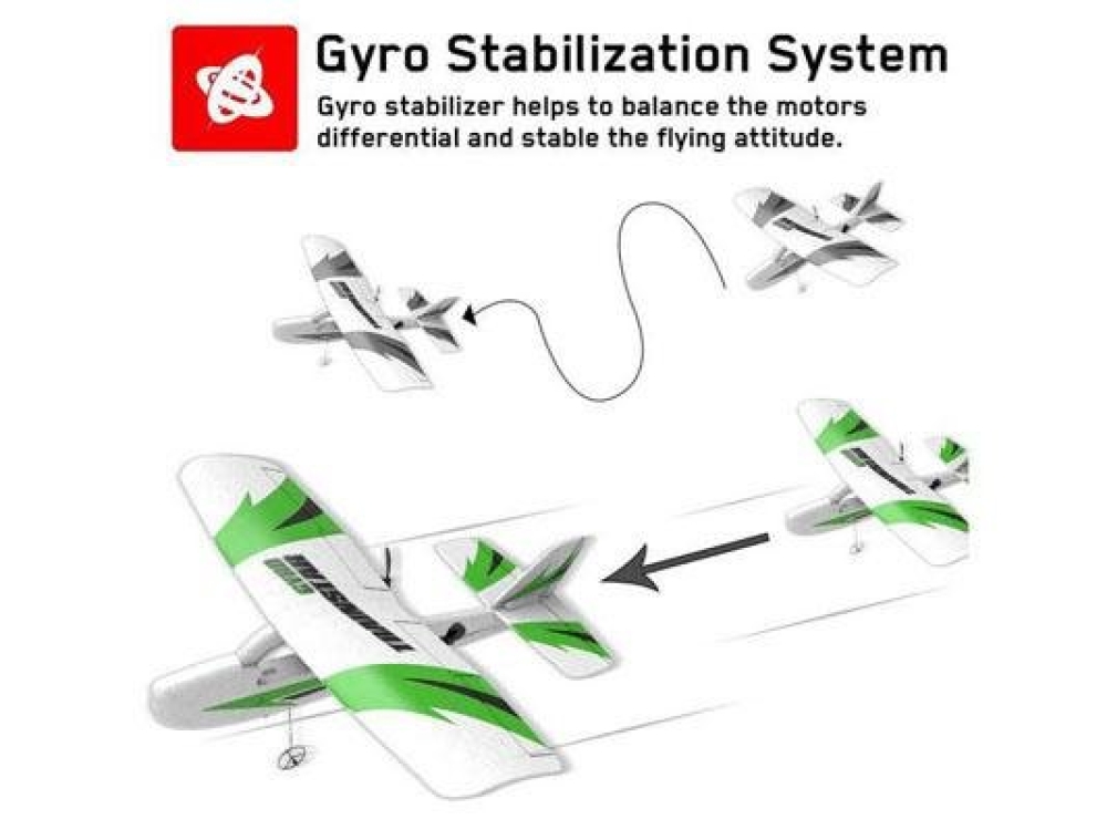 Микро самолет в полной RTF комплектации с электроникой, мотором и аппаратурой управления. Имеет 6-ти осевую стабилизацию за счет гироскопа. В полете самолет автоматически выравнивается при любых отклонениях, сохраняя направление движения. Несмотря на размер самолет подойдет как для полетов в помещении, так и на улице в безветренную погоду. Рабочая частота 2.4 ггц с помехоподавлением позволит летать на значительные расстояния без потери связи.