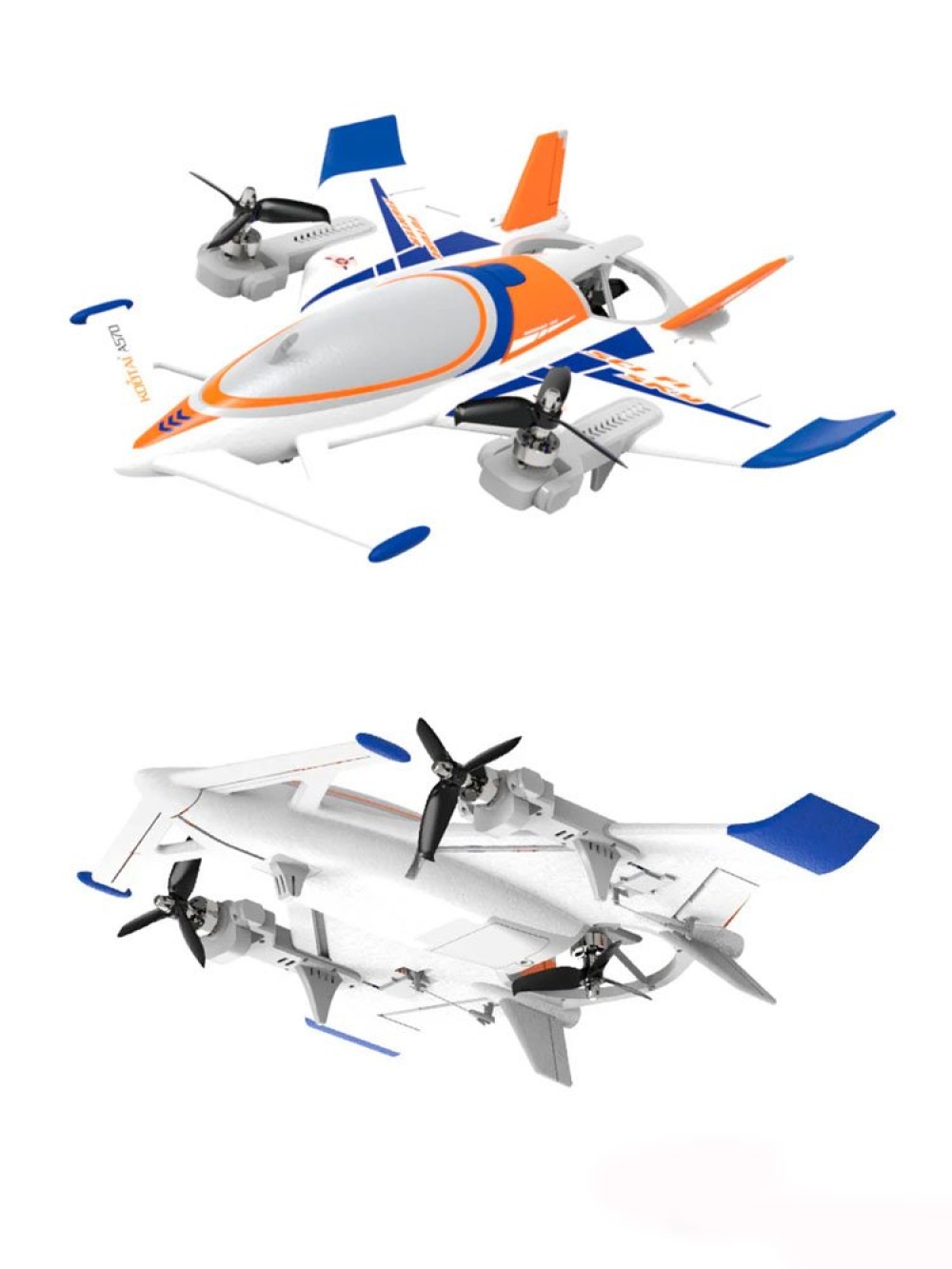 - Три бесколлекторных двигателя с высокоэффективными лопастями для полной мощности и четыре цифровых рулевого управления. Сервоприводы используются, чтобы управлять положением передних двигателей, а также управлять элеронами самолета самолета.