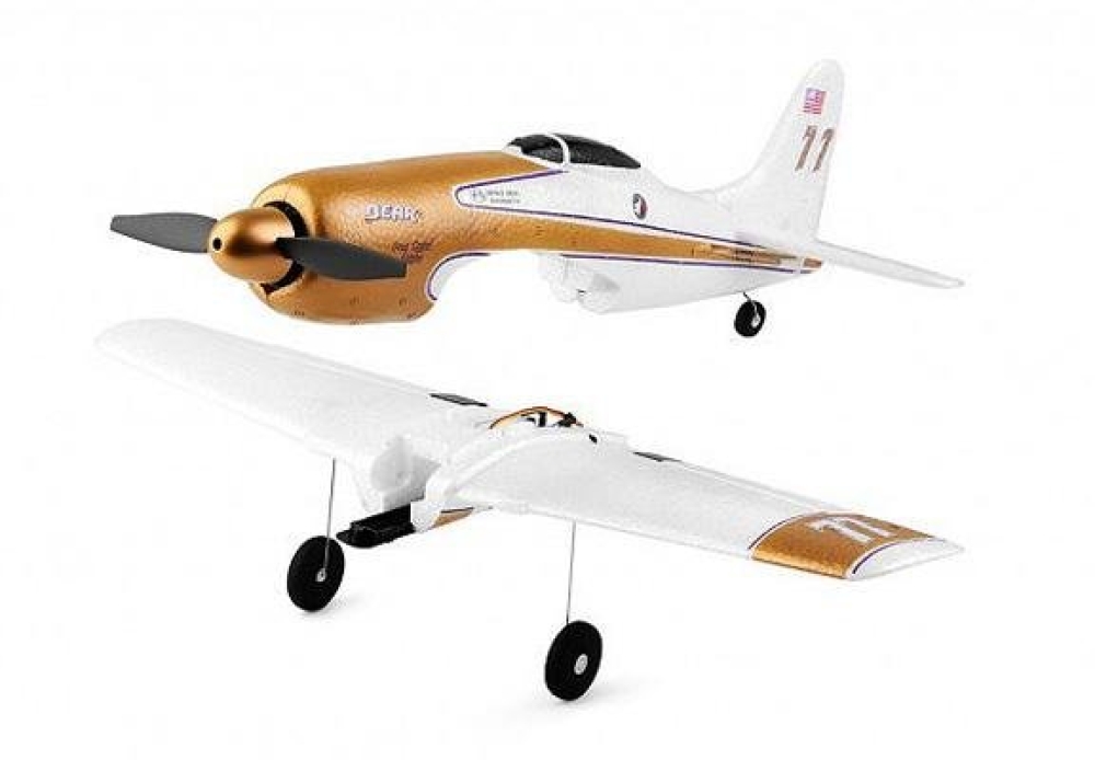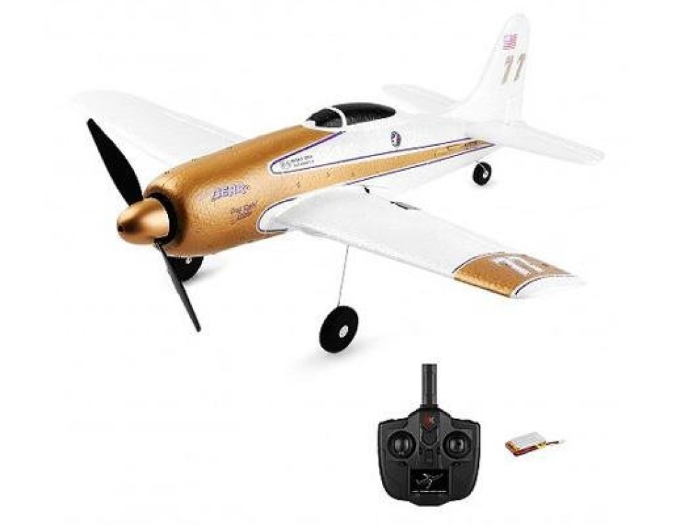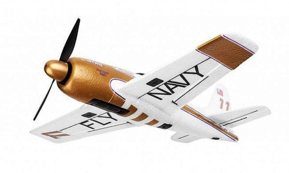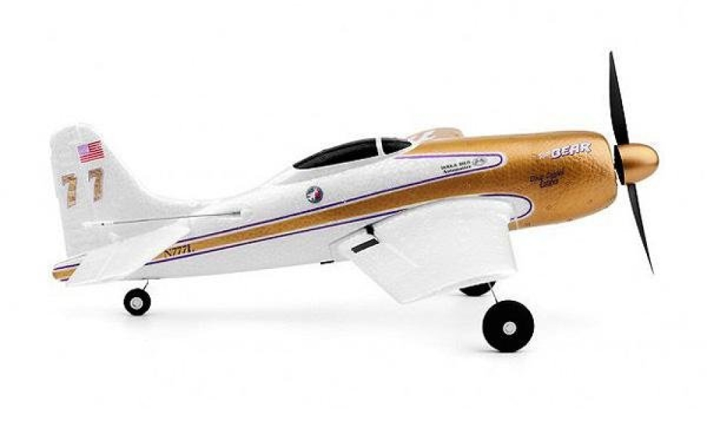 Самолет от XK Innovation на радиоуправлении, копия реального истребителя F7F. Шестиосевой гироскоп облегчает освоение пилотирования для новичков. Пульт четырехканальный. Любителей радиоуправляемых самолетов эта модель порадует возможность исполнять впечатляющие трюки: сальто, кувырки в стороны, полет вверх ногами. Цвет самолета - золотой с белым, есть декали.