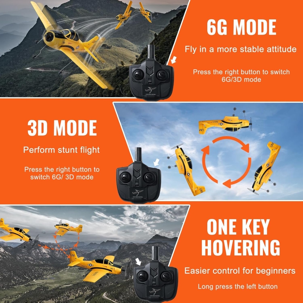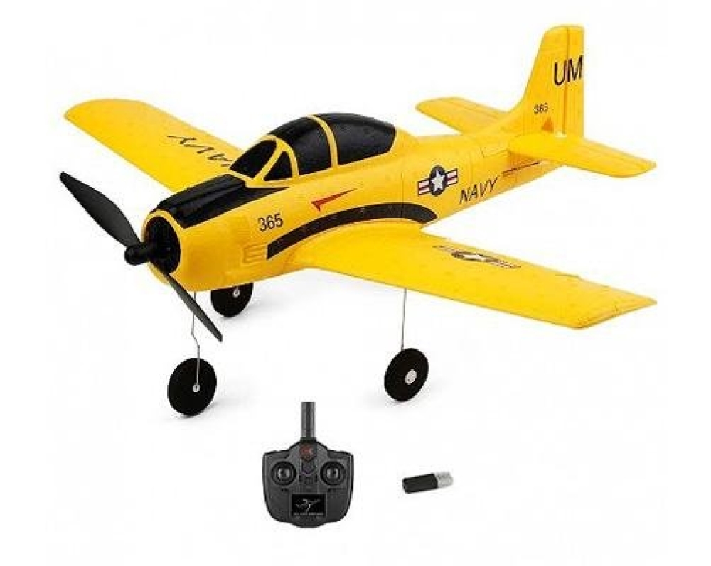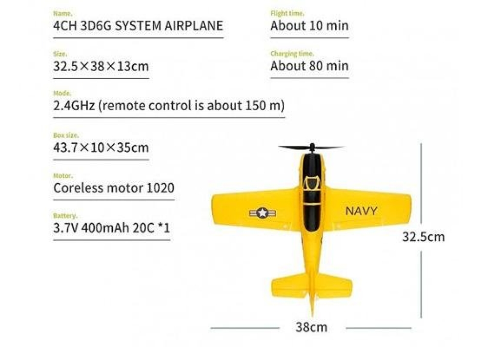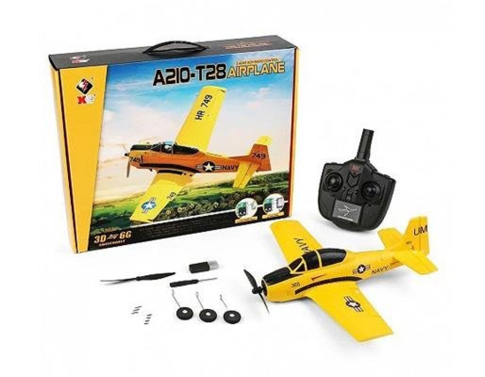 Самолет от XK Innovation на радиоуправлении, копия реального истребителя Т28. Шестиосевой гироскоп облегчает освоение пилотирования для новичков. Пульт четырехканальный. Любителей радиоуправляемых самолетов эта модель порадует возможность исполнять впечатляющие трюки: сальто, кувырки в стороны, полет вверх ногами. Цвет самолета - черно-желтый, есть декали.