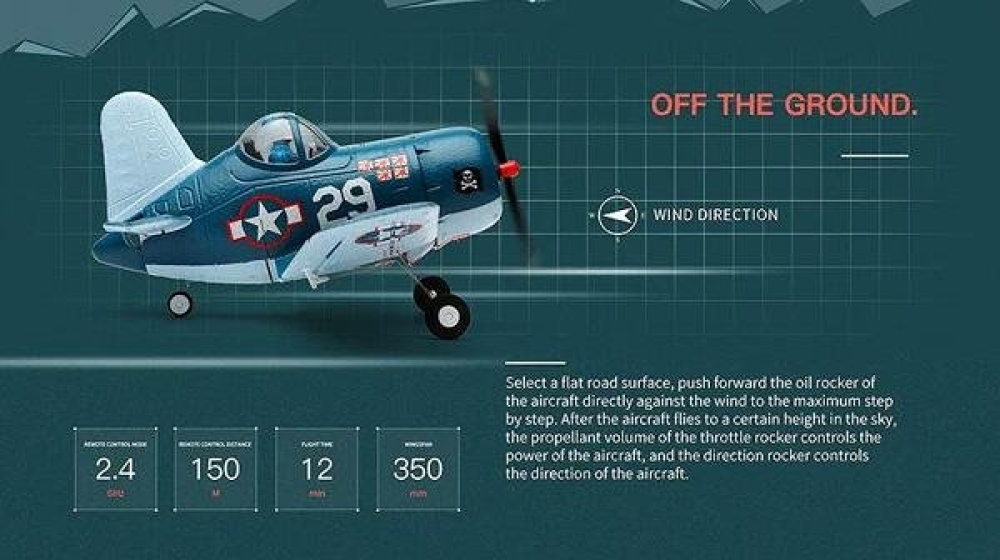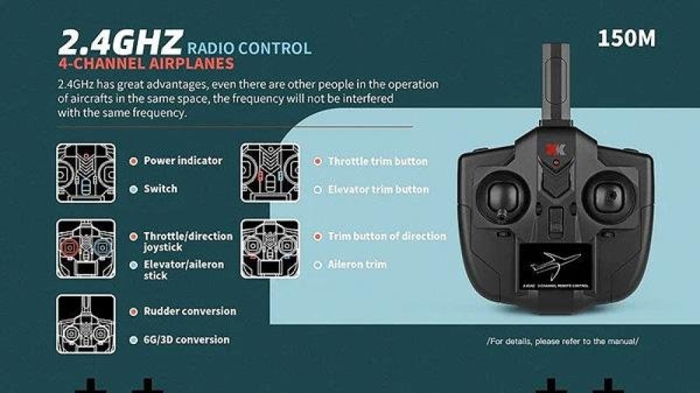 - 4-х канальная аппаратура управления 2.4Ghz позволит управлять самолетом в радиусе 150 метров