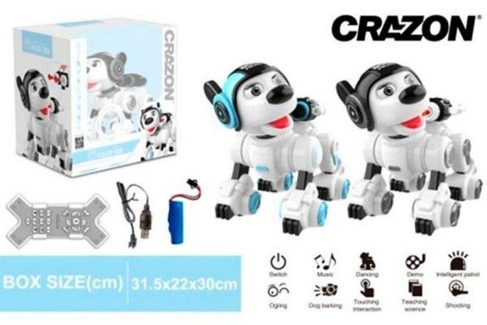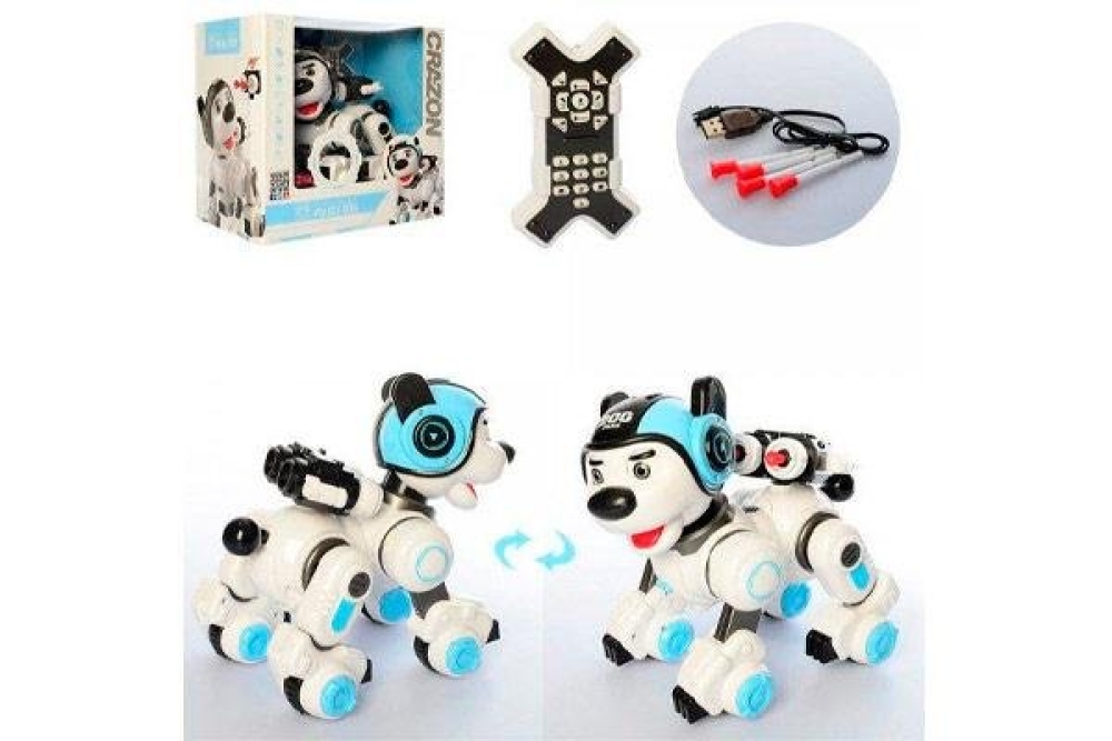 Радиоуправляемая робот-собака Сrazon на пульте управления это интерактивная игрушка, которая может ездить вертеть головой как настоящая . Имеет различные музыкальные и звуковые эффекты а также может танцевать, и выполнять большое количество предустановленных команд. Собака умеет преподавать английский язык, рассказывать различные истории, поёт, танцует, а также имеет функцию программирования. Собачка может моргать, двигать лапами и туловищем. Эта модель является космической игрушкой, поэтому на спине расположена пушка, которая может стрелять пулями и поражать цели во всех направлениях. Аккумуляторная батарея емкостью 400 mah 3.7v позволяет играть без подзарядки до 45 минут на расстоянии до 15 м на инфракрасном управлении. Игрушка подойдет детям от 3 лет, она станет отличным подарком на день рождения или Новый год.