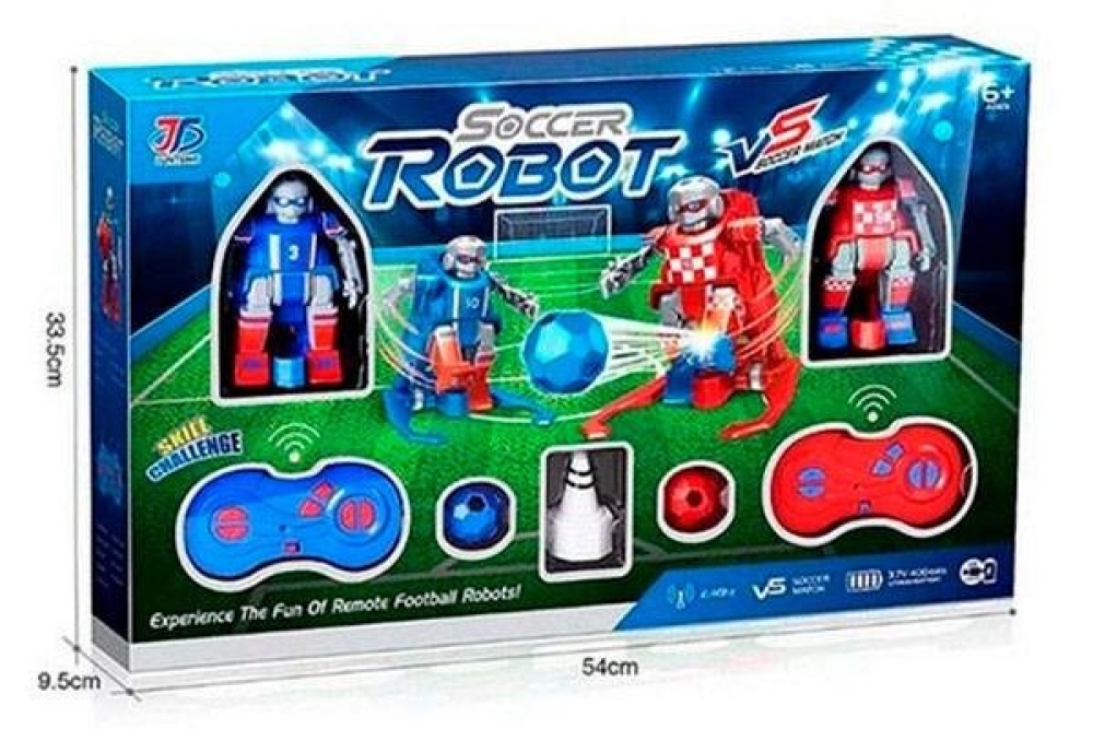 Роботы футболисты на пульте управления это два полноценных робота игрушки, которые умеют перемещаться, двигать руками, ногами и пинать мяч. В комплекте идёт футбольное поле с мячом, поэтому ваши дети смогут играть в футбол не выходя из дома. Дальность управления составляет более 10 метров, что позволяет превратить вашу комнату в настоящий стадион для детей и подарит море положительных эмоций. Время работы составляет 45 минут что равноценно целому футбольному тайму, аккумуляторная батарея в комплекте имеет емкость 400 mah. 2 радиоуправляемых робота станут отличным подарком для ребёнка на любой праздник, в эту игрушку могут играть как дети так и взрослые.