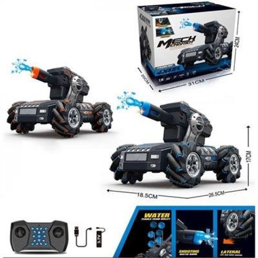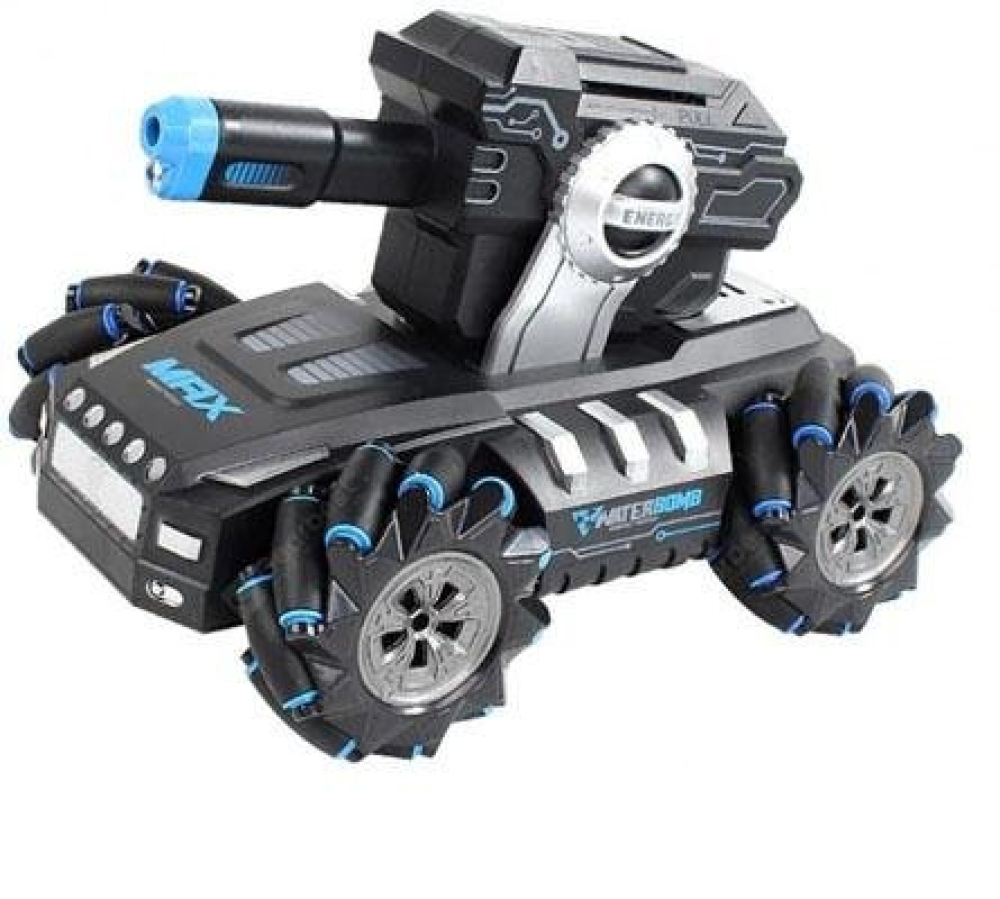 Танк робот в синем цвете оснащен мощной пушкой. Боевое орудие стреляет мягкими гелевыми шариками, поэтому не представляет опасности человеку. Прицельная дальность выстрела до 5 метров. Снаряды можно приготовить самостоятельно, т.к. гидрогелевый порошок идет в комплекте. Для маневрирования в узких пространствах, например, в квартире, имеет уникальные колеса с роликами. Благодаря им он может вращаться вокруг своей оси, и ездить по диагонали, а также дрифтить в поворотах.