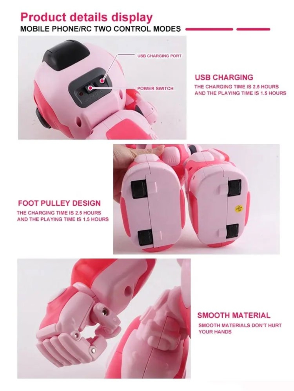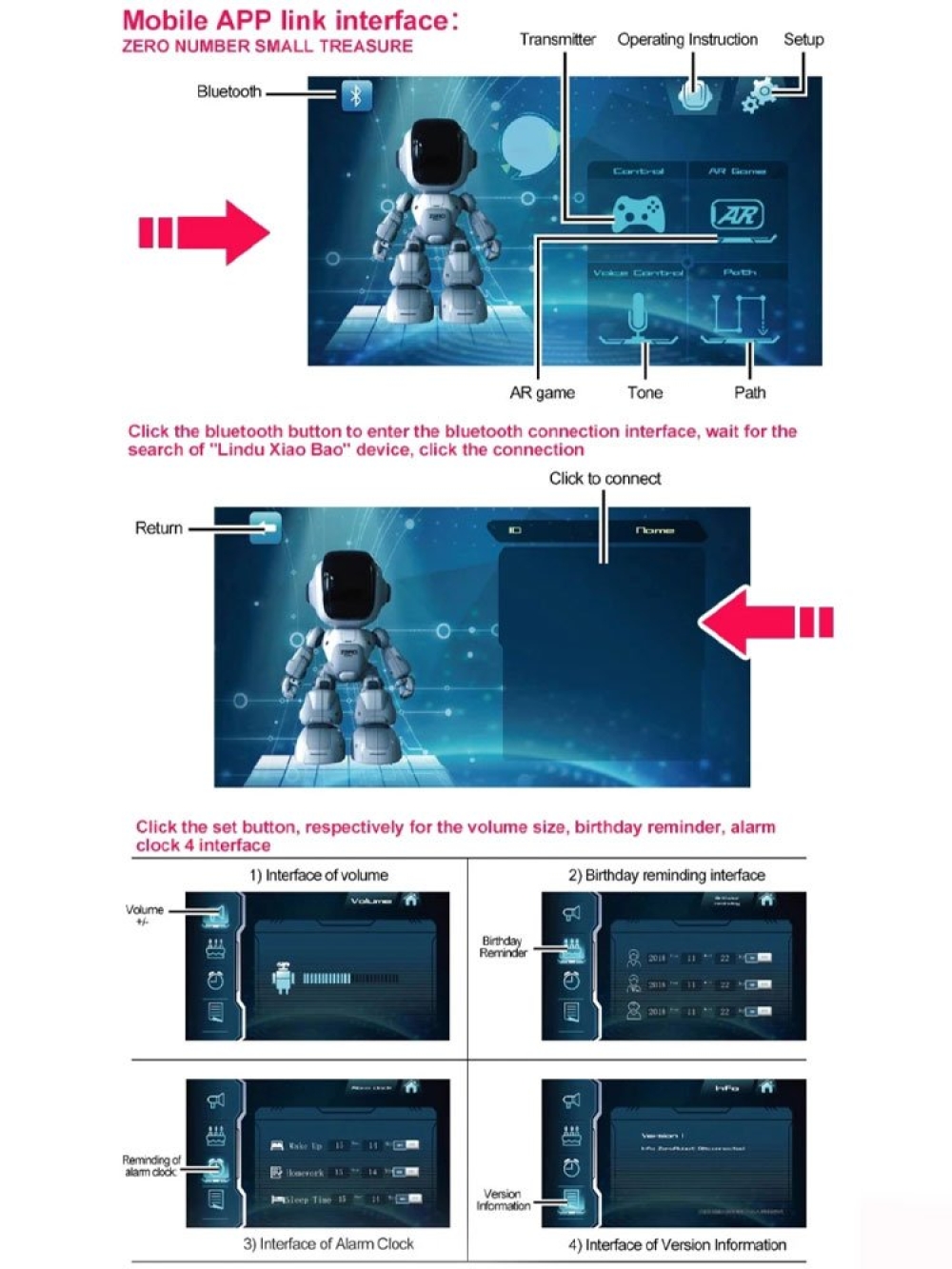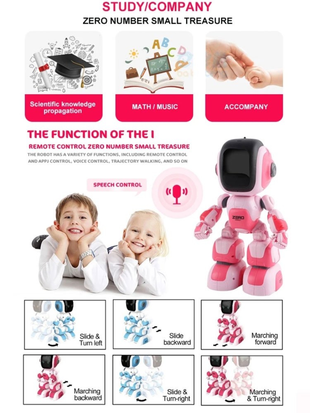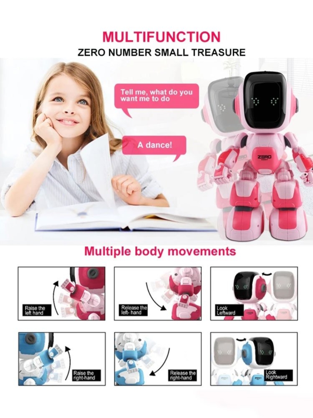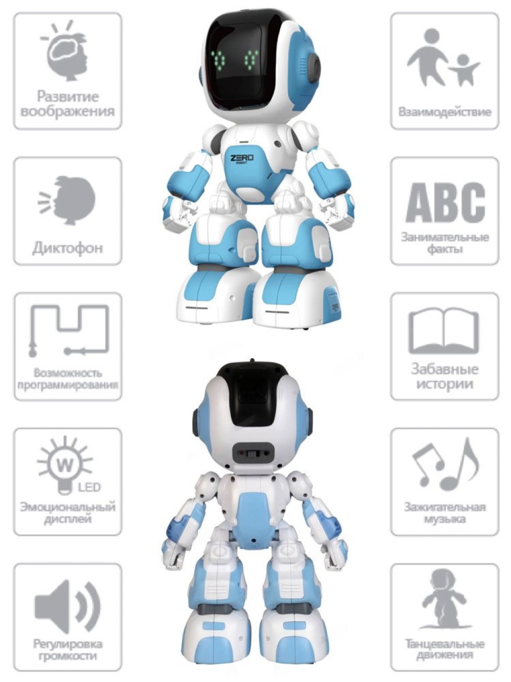 Особенности: Робот имеет множество функций, он может танцевать, петь, играть в игры, преподавать английский язык и рассказывать истории. Робот имеет функцию голосового управления Вы можете управлять роботом с помощью приложения. Дистанция управления до 20 метров.