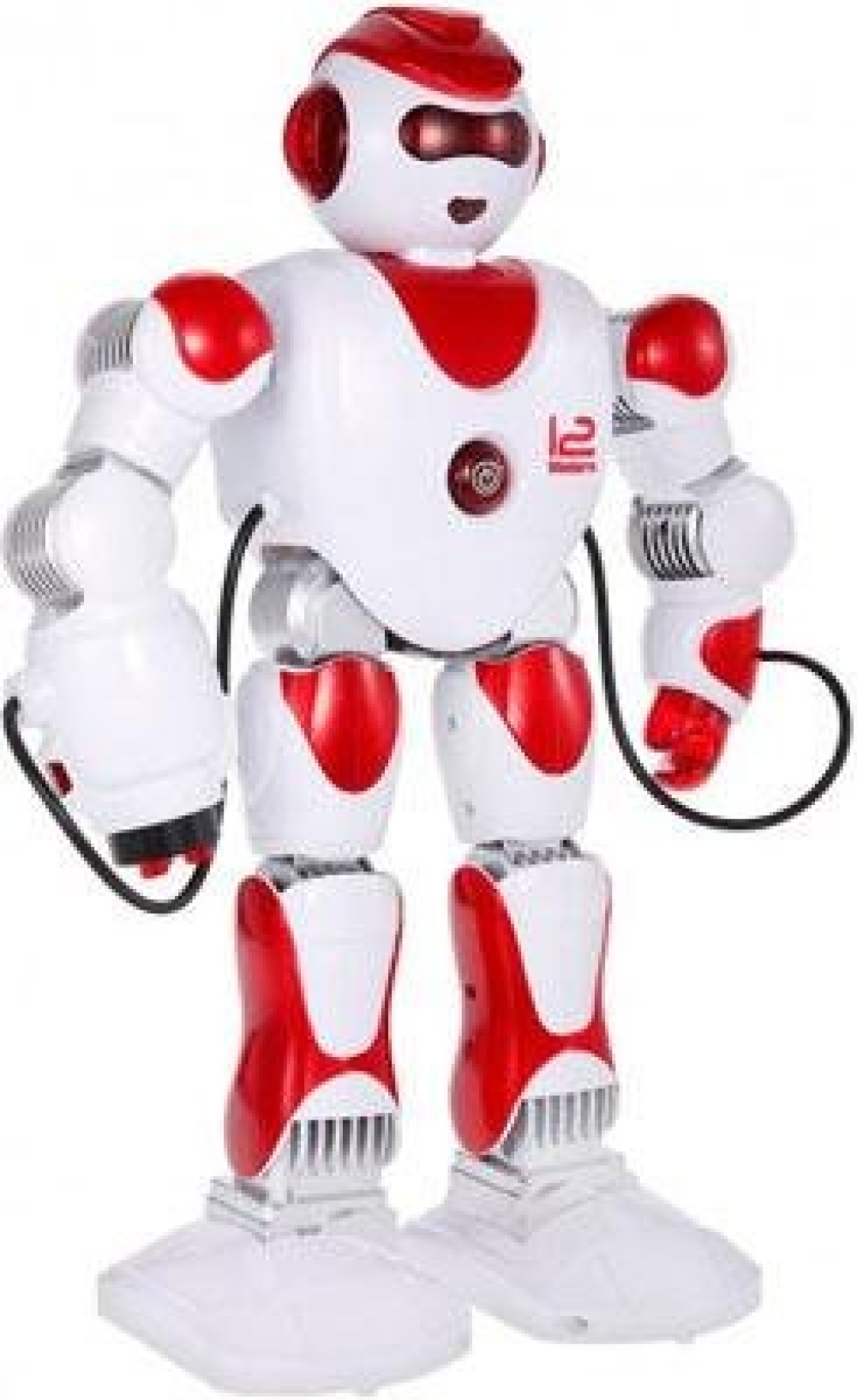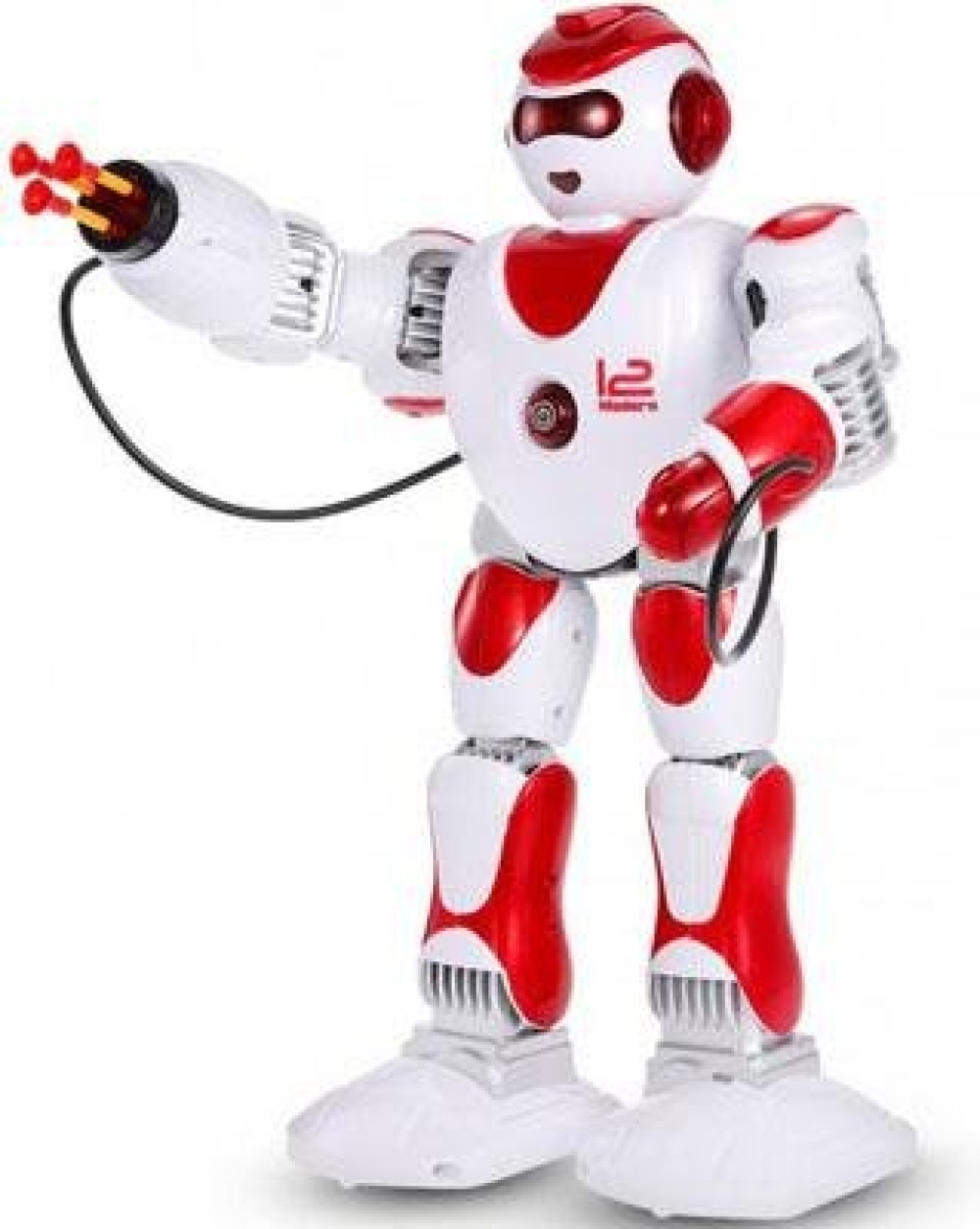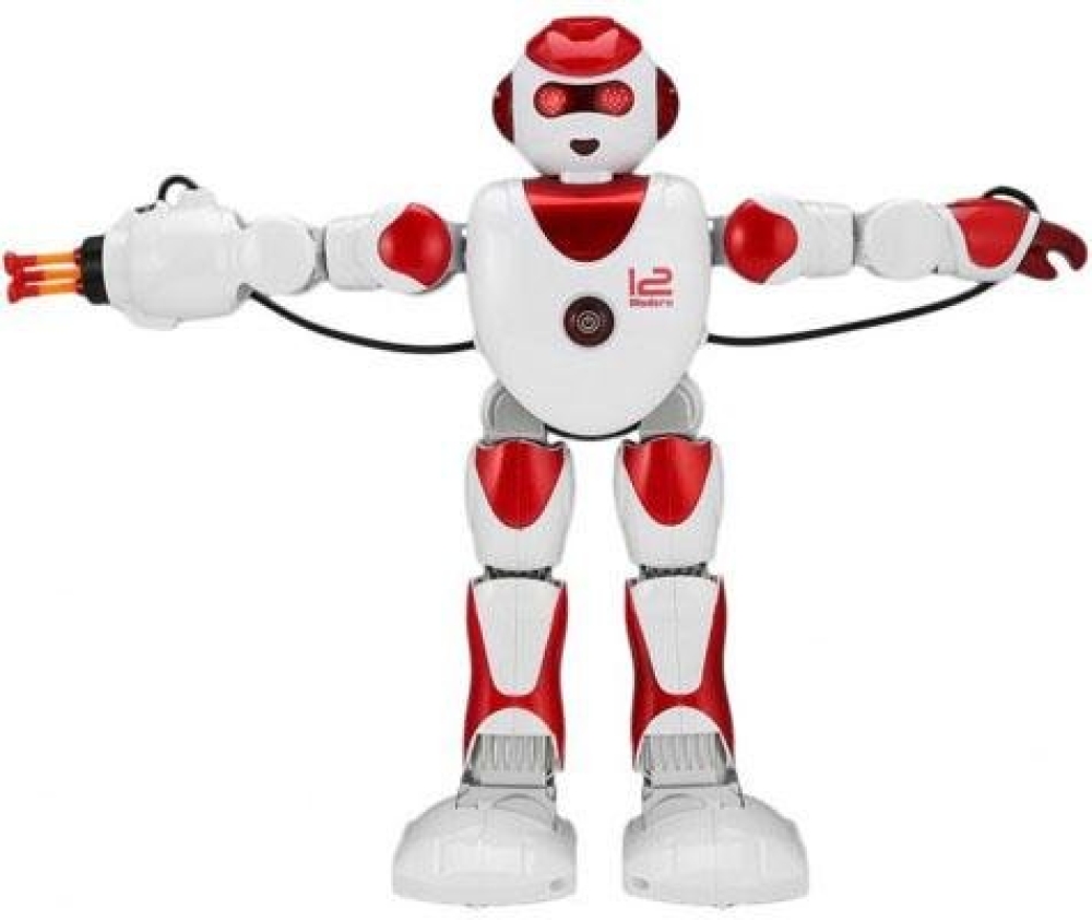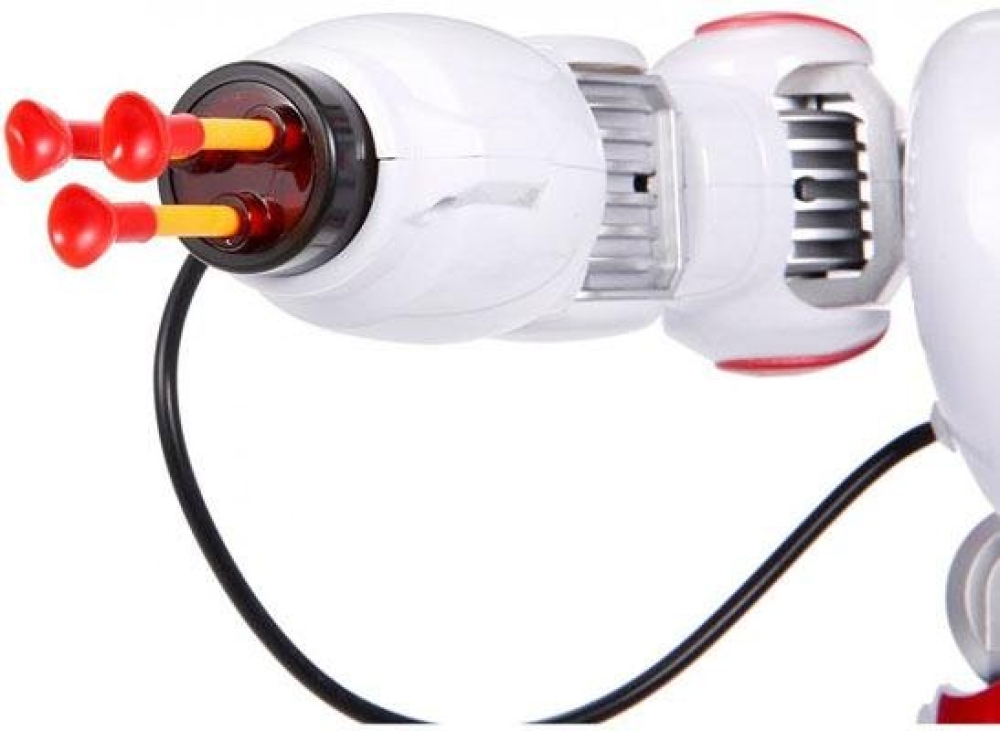 Игрушка робот с интерактивными функциями - умеет ходить. танцевать, двигать руками, петь и рассказывать сказки. Лицо робота оснащено светодиодными огнями, игра сопровождается световыми и звуковыми эффектами. Обладает русской озвучкой. Одна из рук робота оснащена пушкой - 3 стрелы с присосками готовы к бою.
